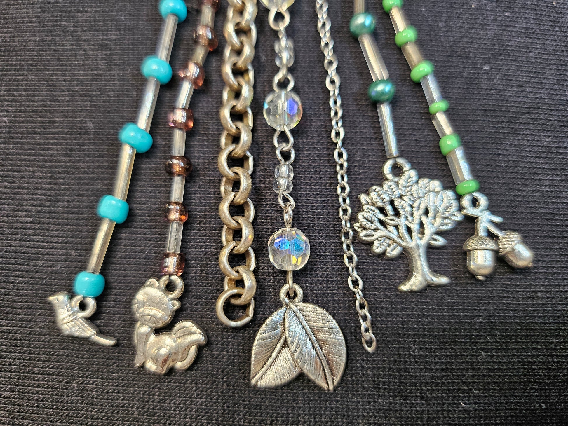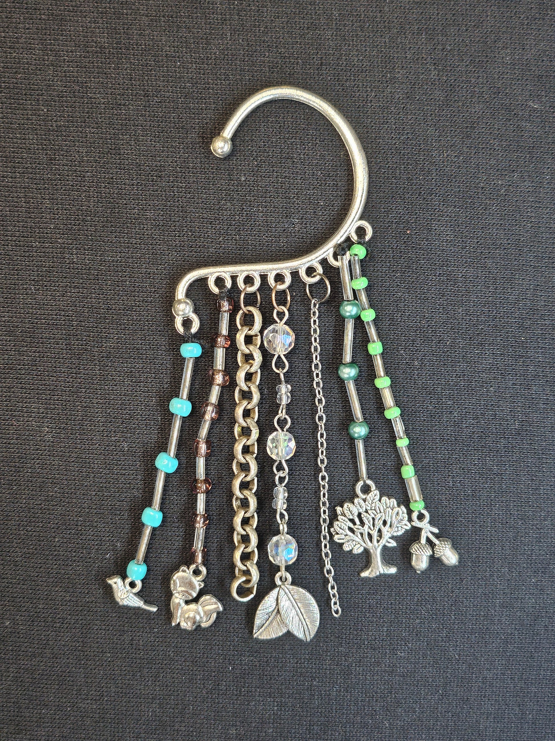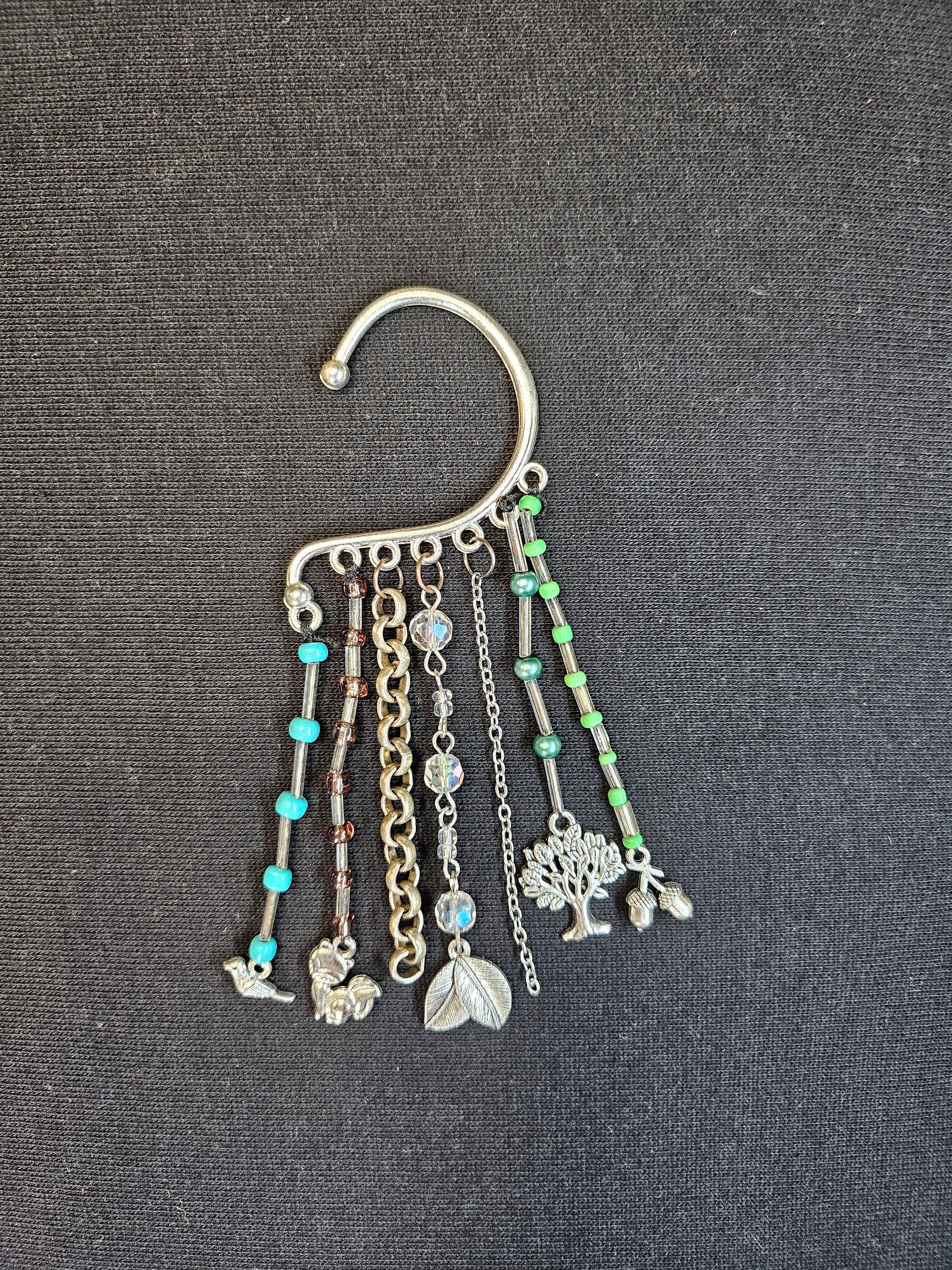 This ear cuff has a silver base. There are various beaded strands and silver chains. The charms are all based on forest motifs: a squirrel, a bird, leaves, acorns, and a tree. The beaded strands have long clear beads and various green and brown beads.