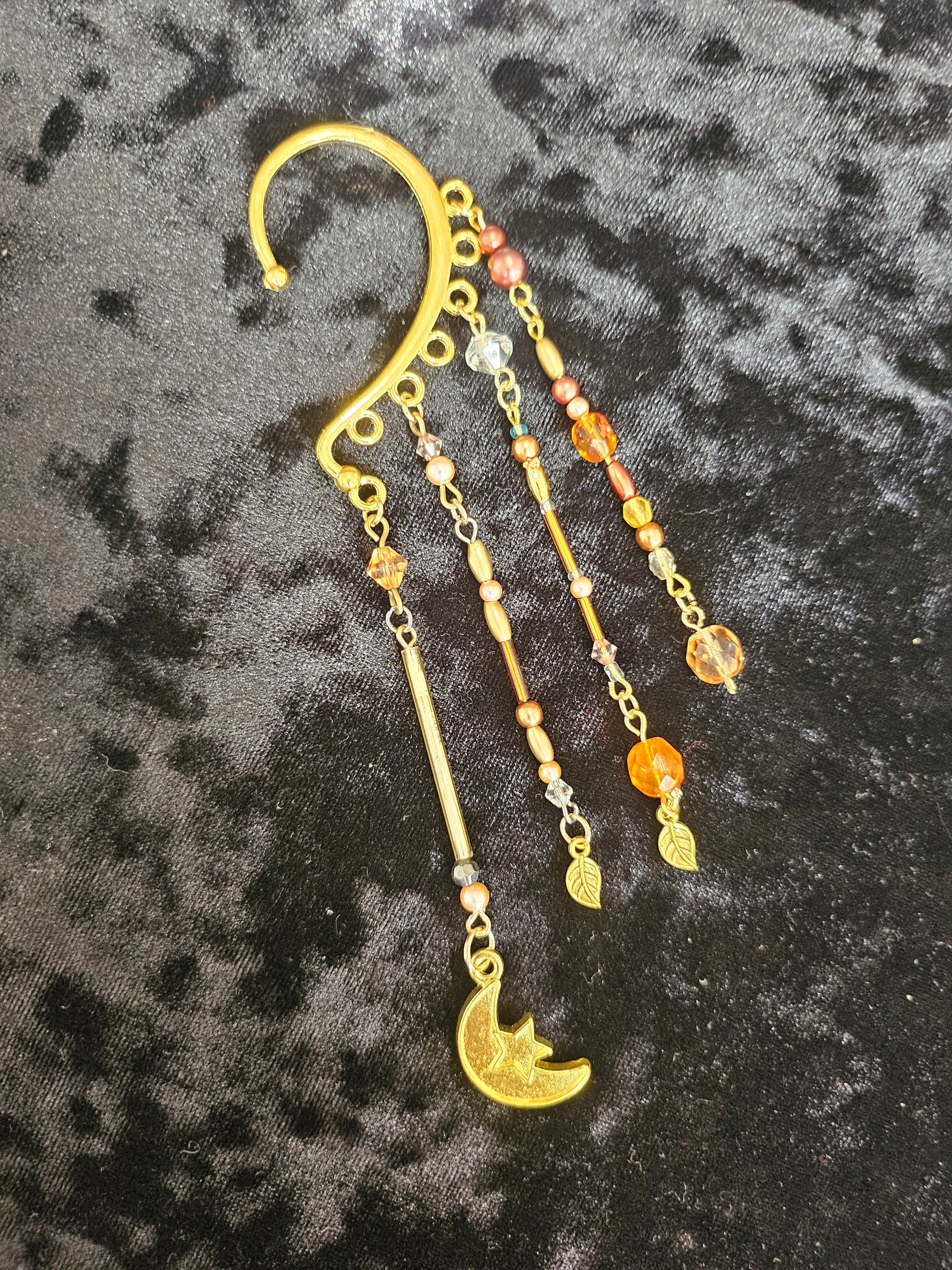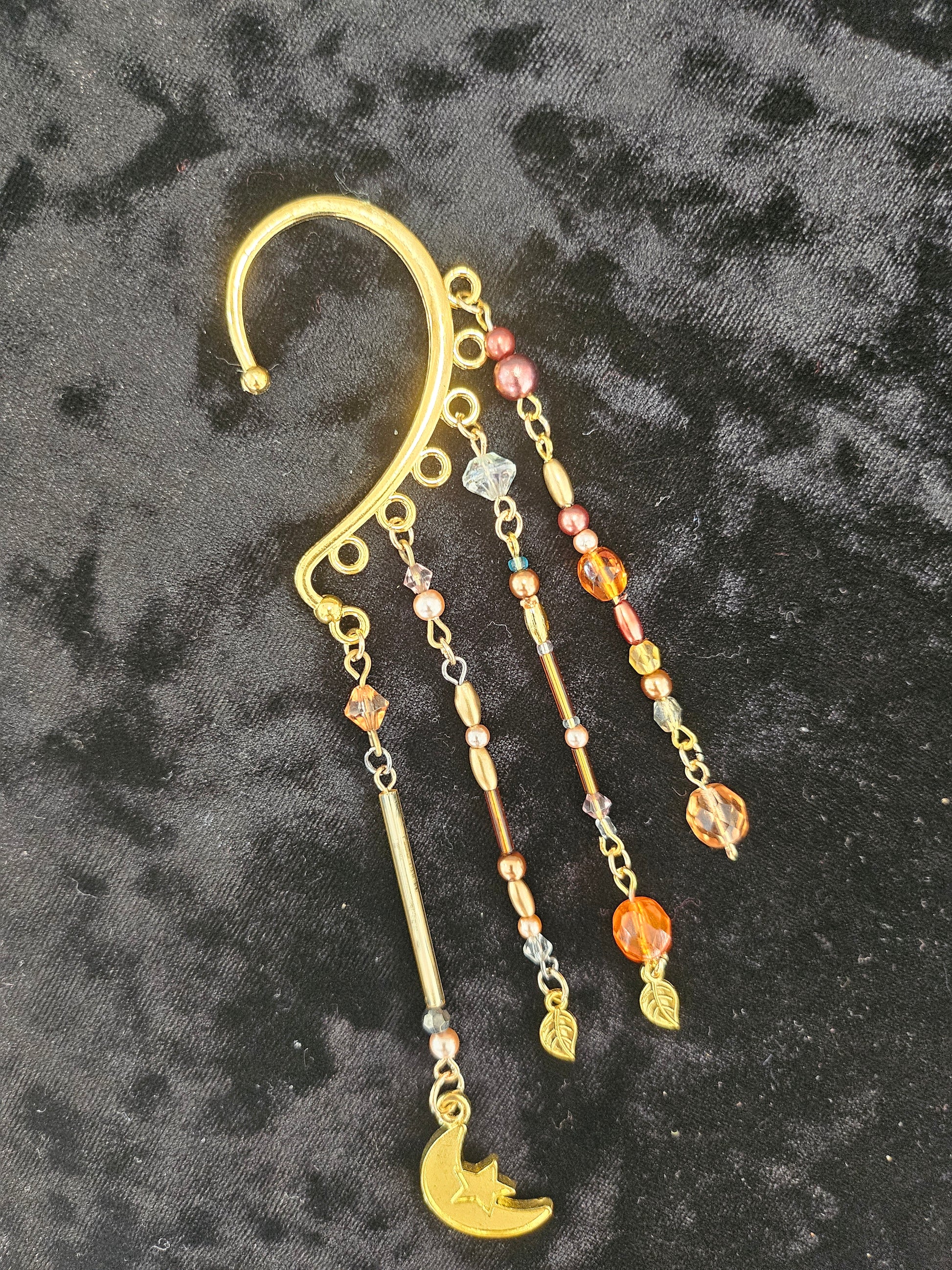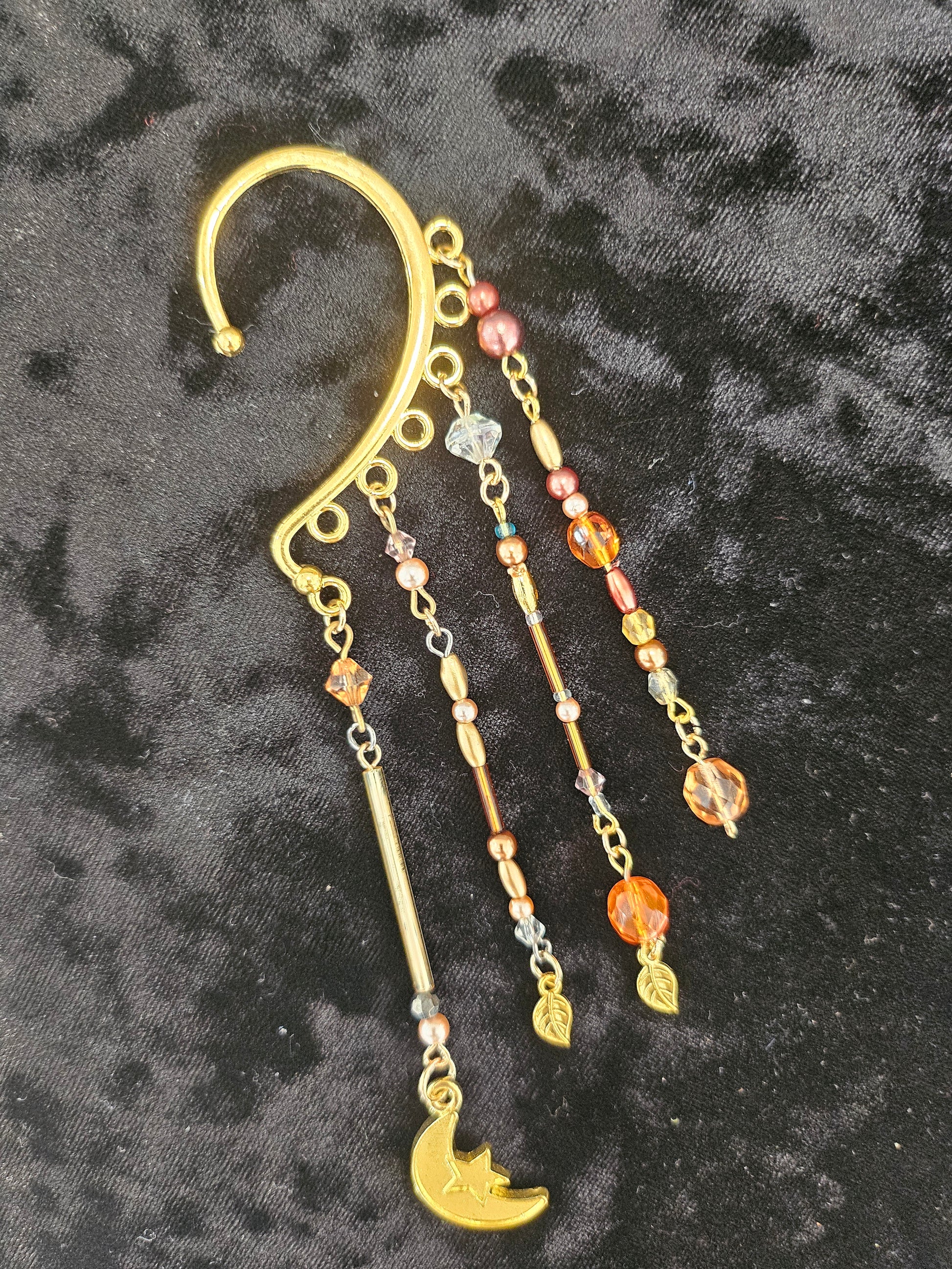 This ear cuff has a base of gold. There are 4 hand-beaded eye-pin strands with a variety of autumnal hues. There are two leaf charms and 1 moon charm in gold.