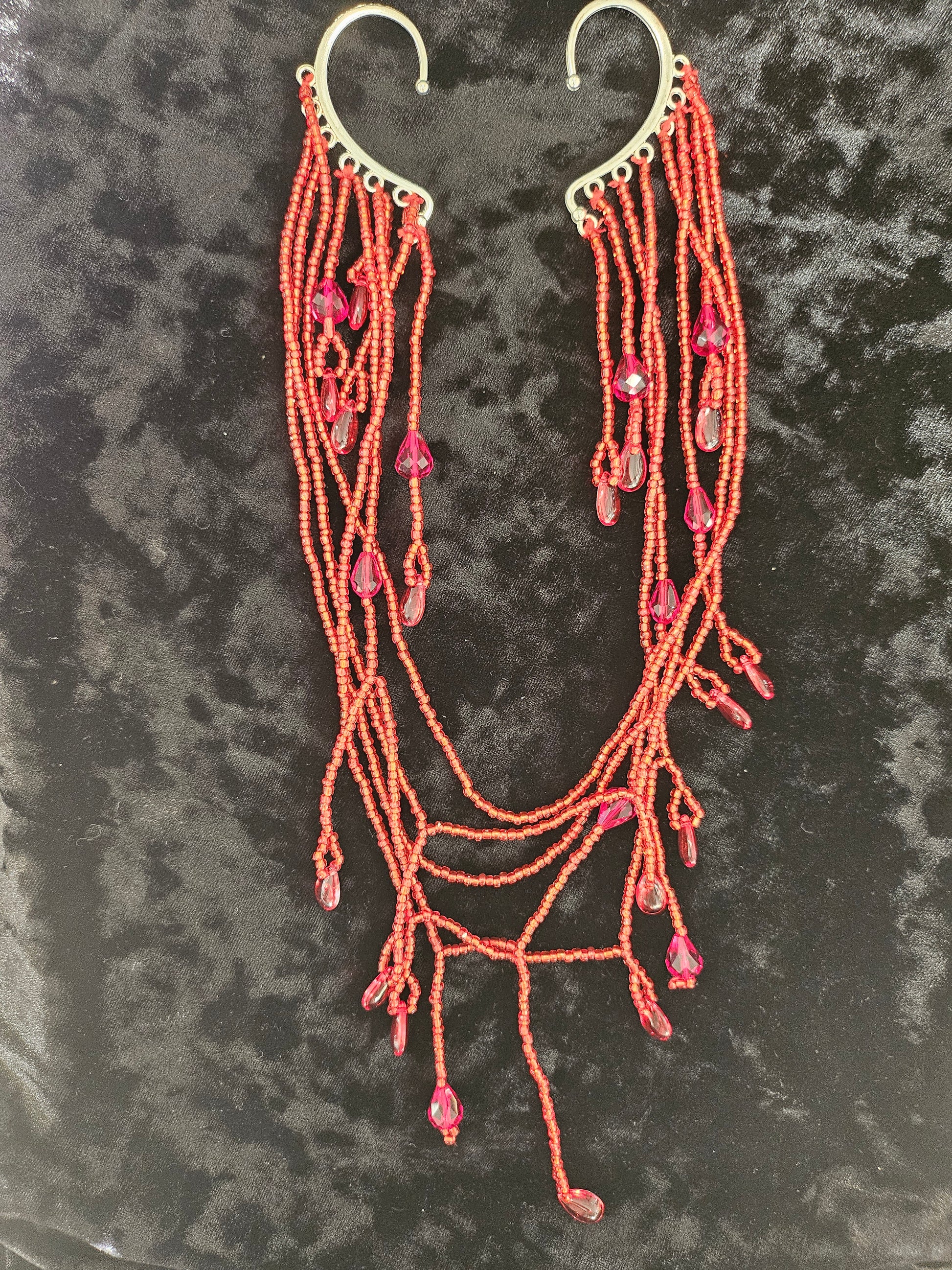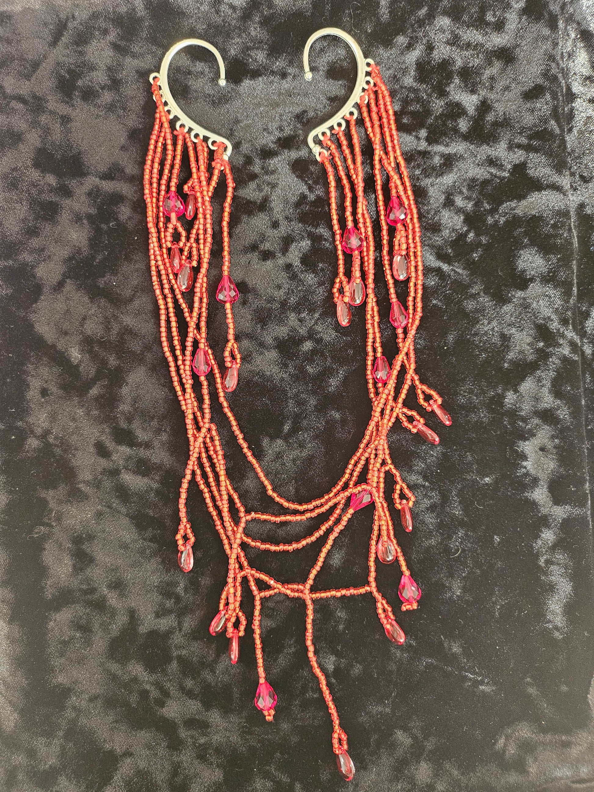 This one of a kind piece uses 2 XL ear cuffs with hand beaded strands of red seed beads, crystals and droplets.