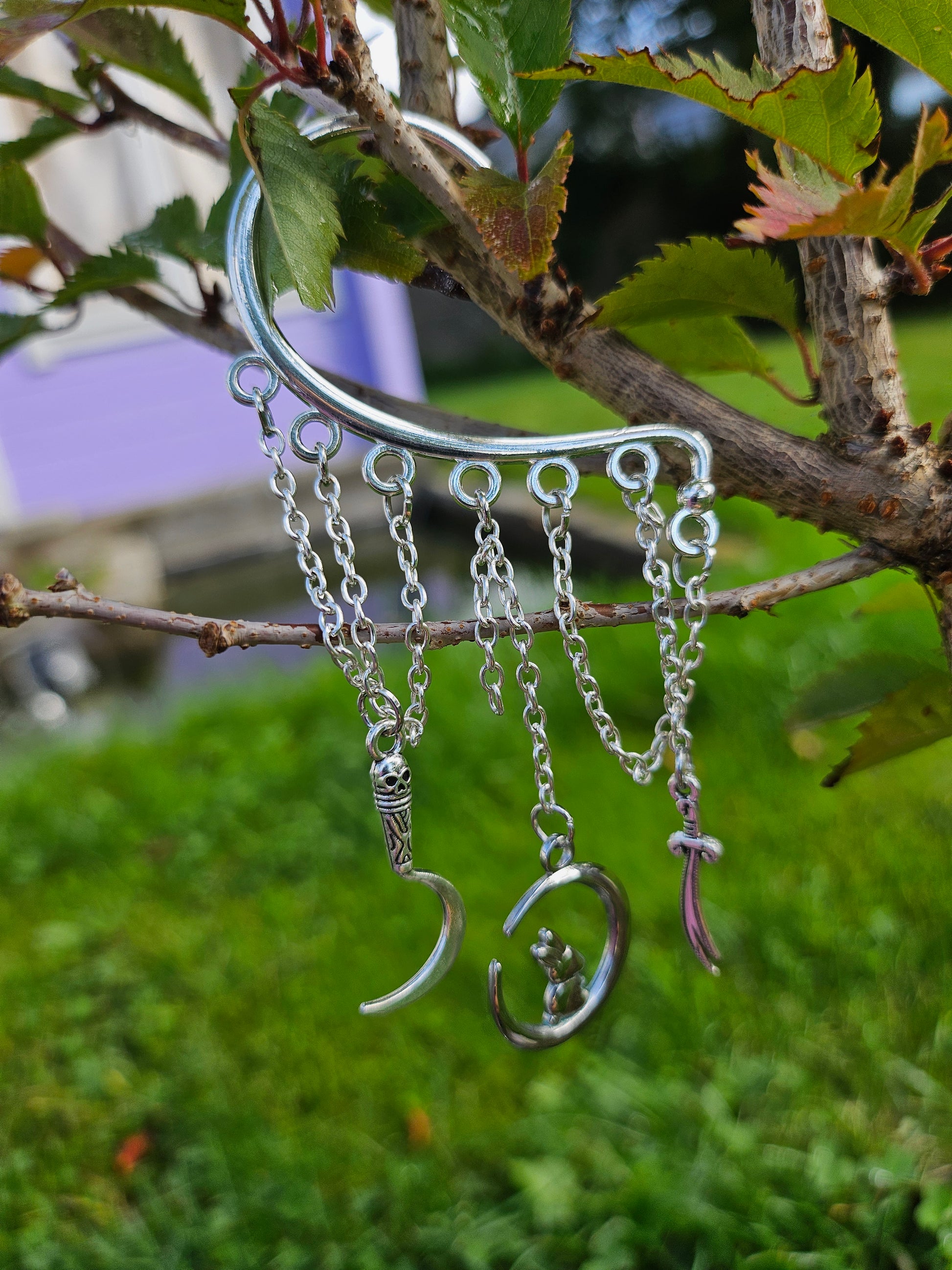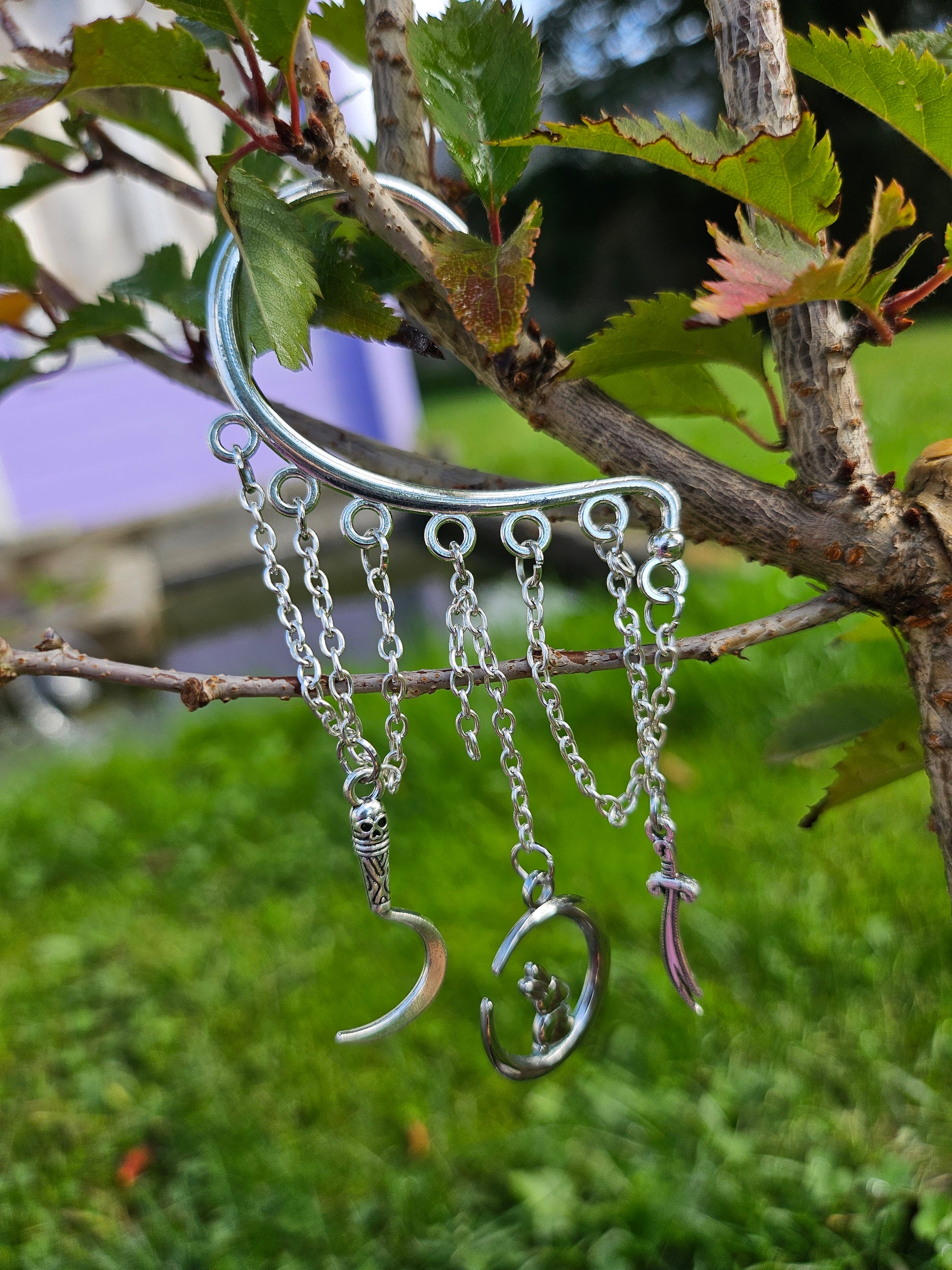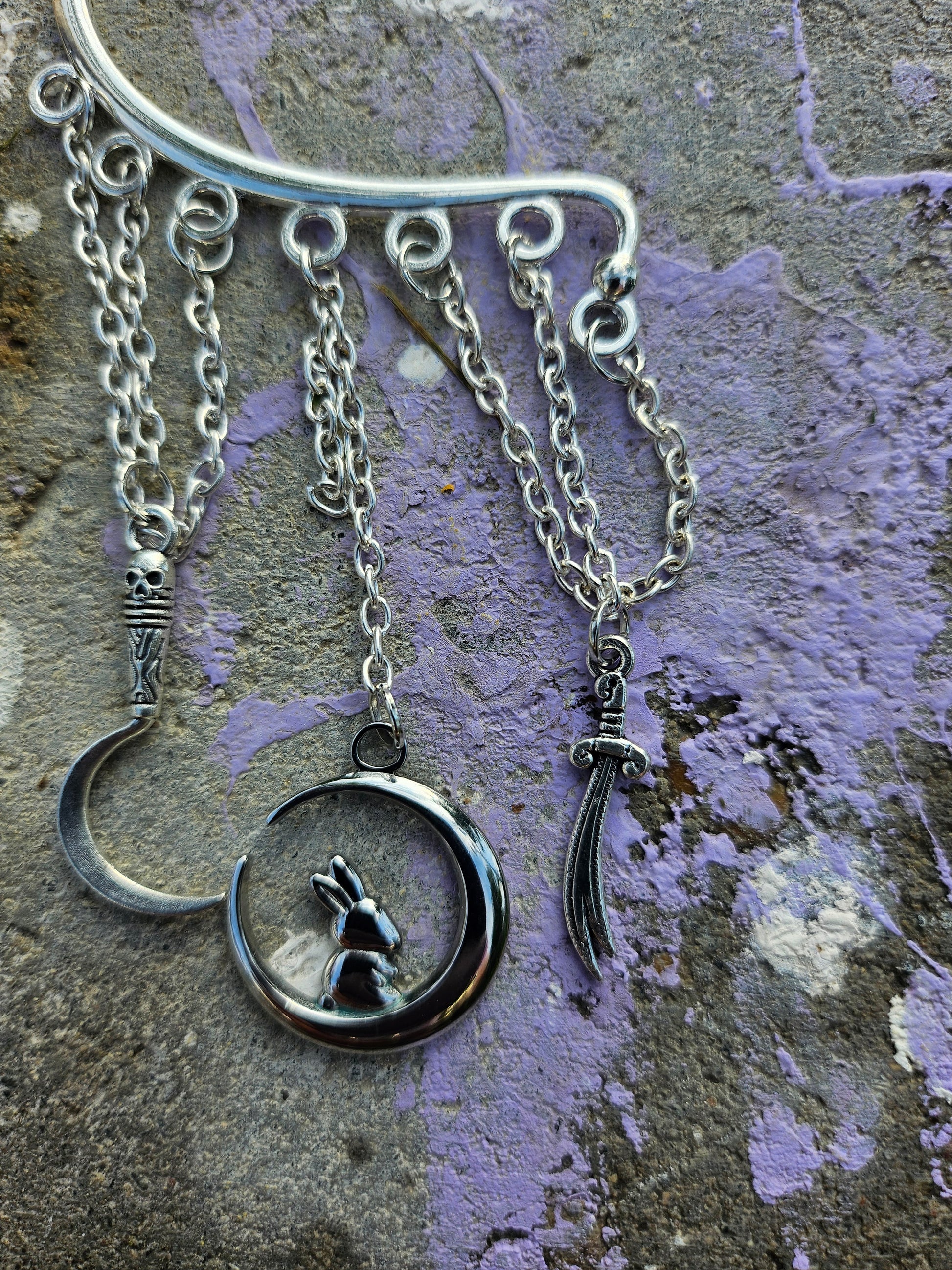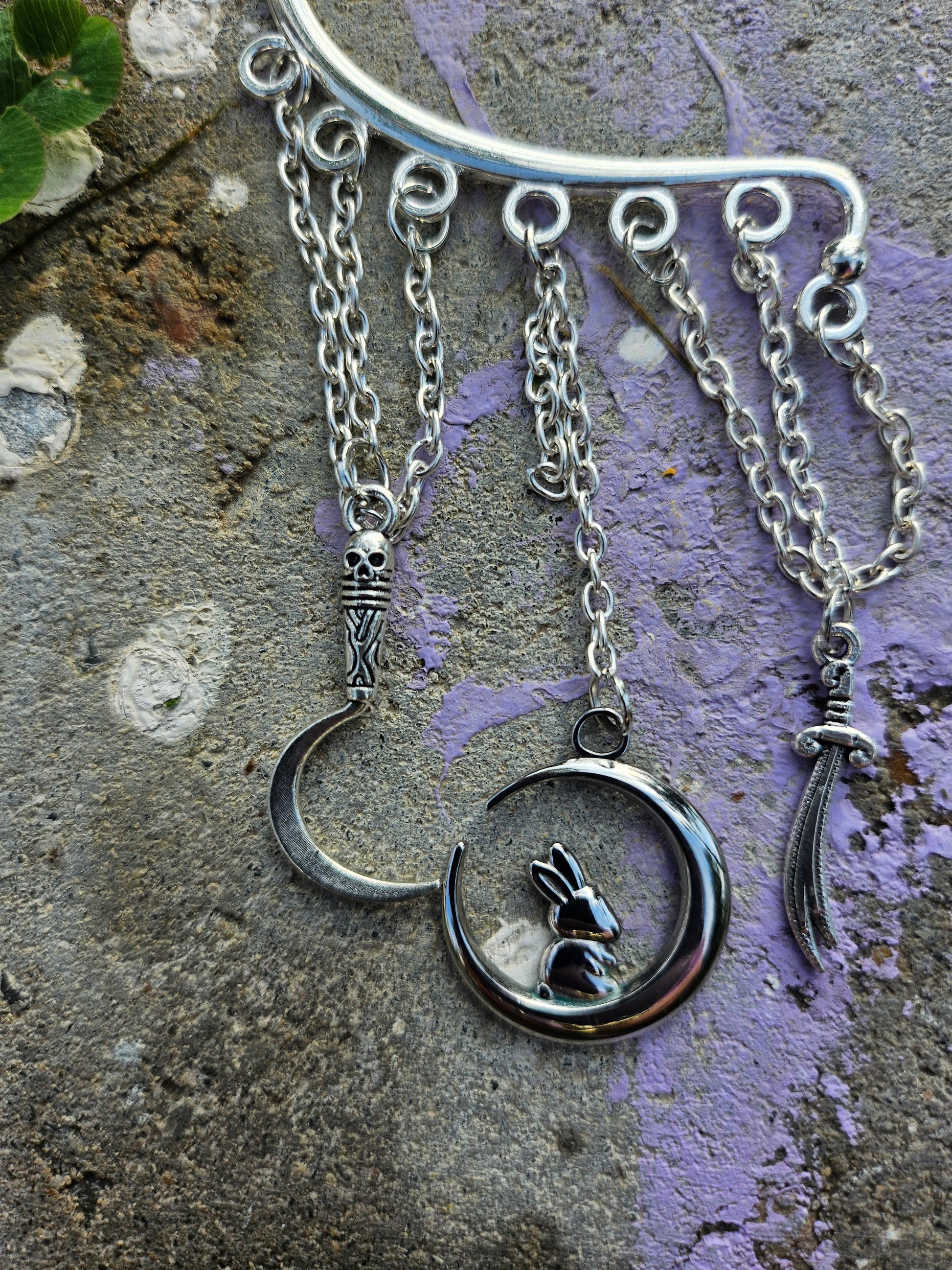 This ear cuff has a base that is silver. There are silver chains with silver charms: bunny moon, a sickle, and a scimitar.