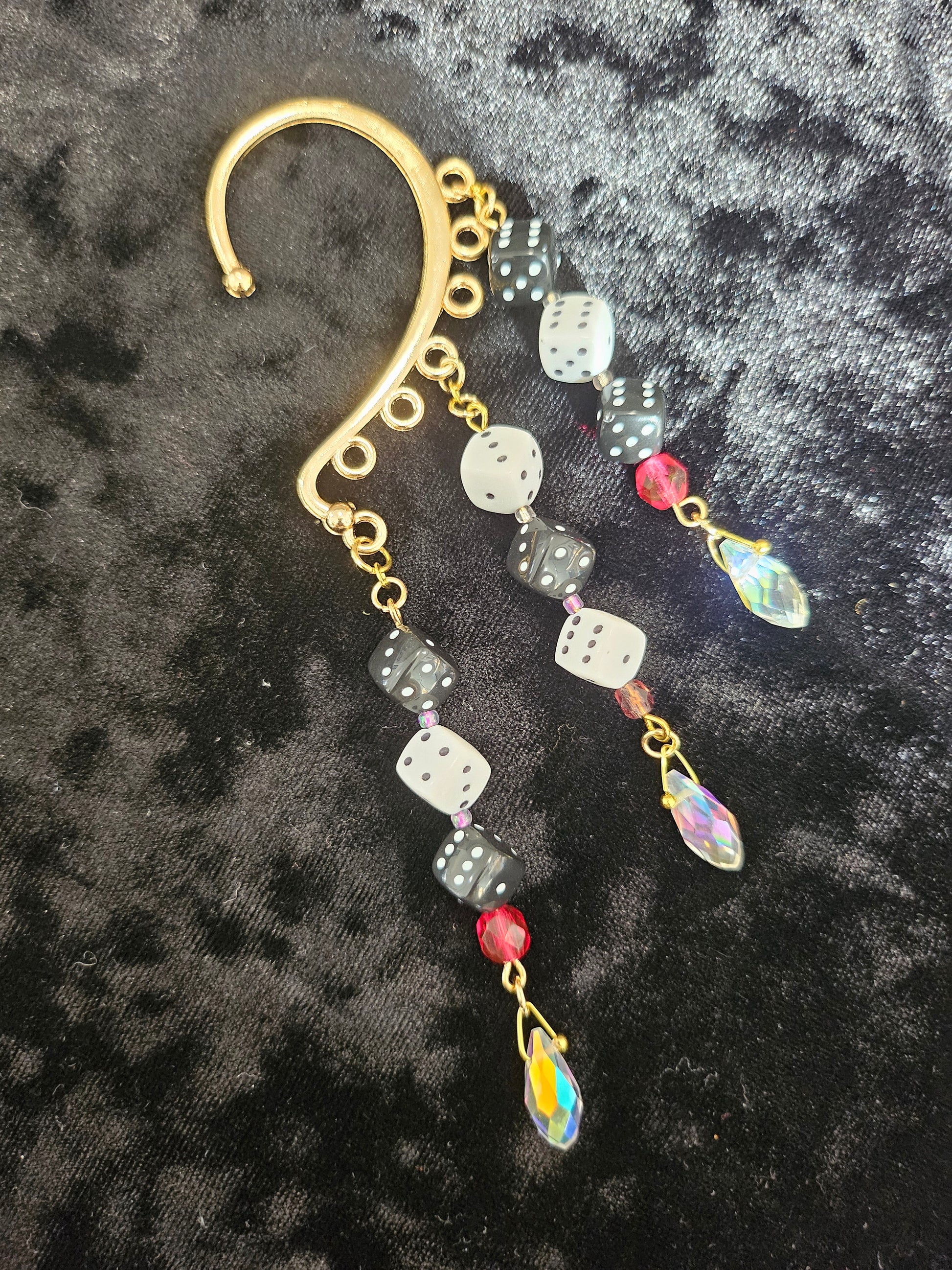 This ear cuff has a base of gold. There are 3 strands of hand-beaded eye-pins with alternating black and white dice. At the end of the pins are small red beads and crystals.