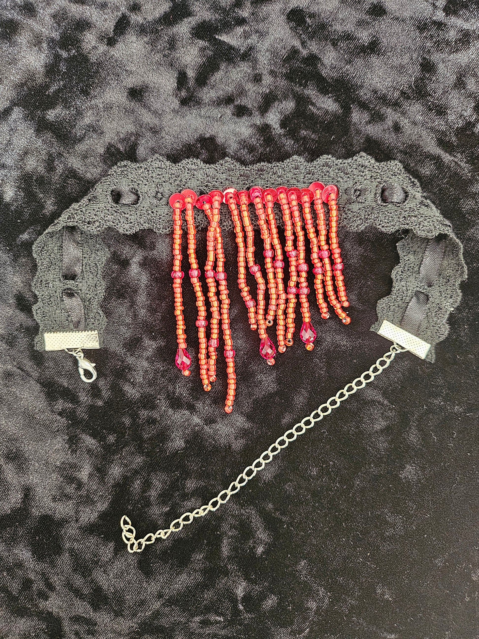 This is a lace choker with red sequins and red seed beed strands coming out of the center. This is hand created. There is ribbon crimps at the end along with a lobster clasp and necklace extenders.