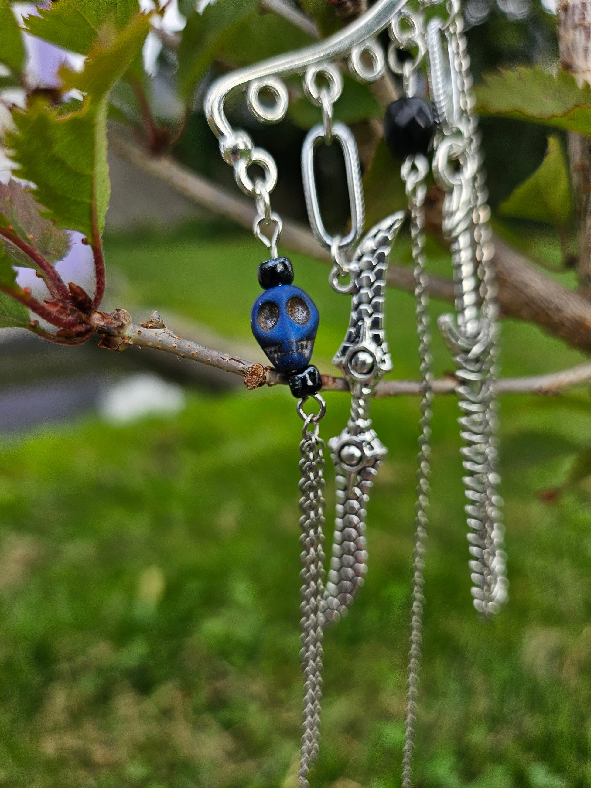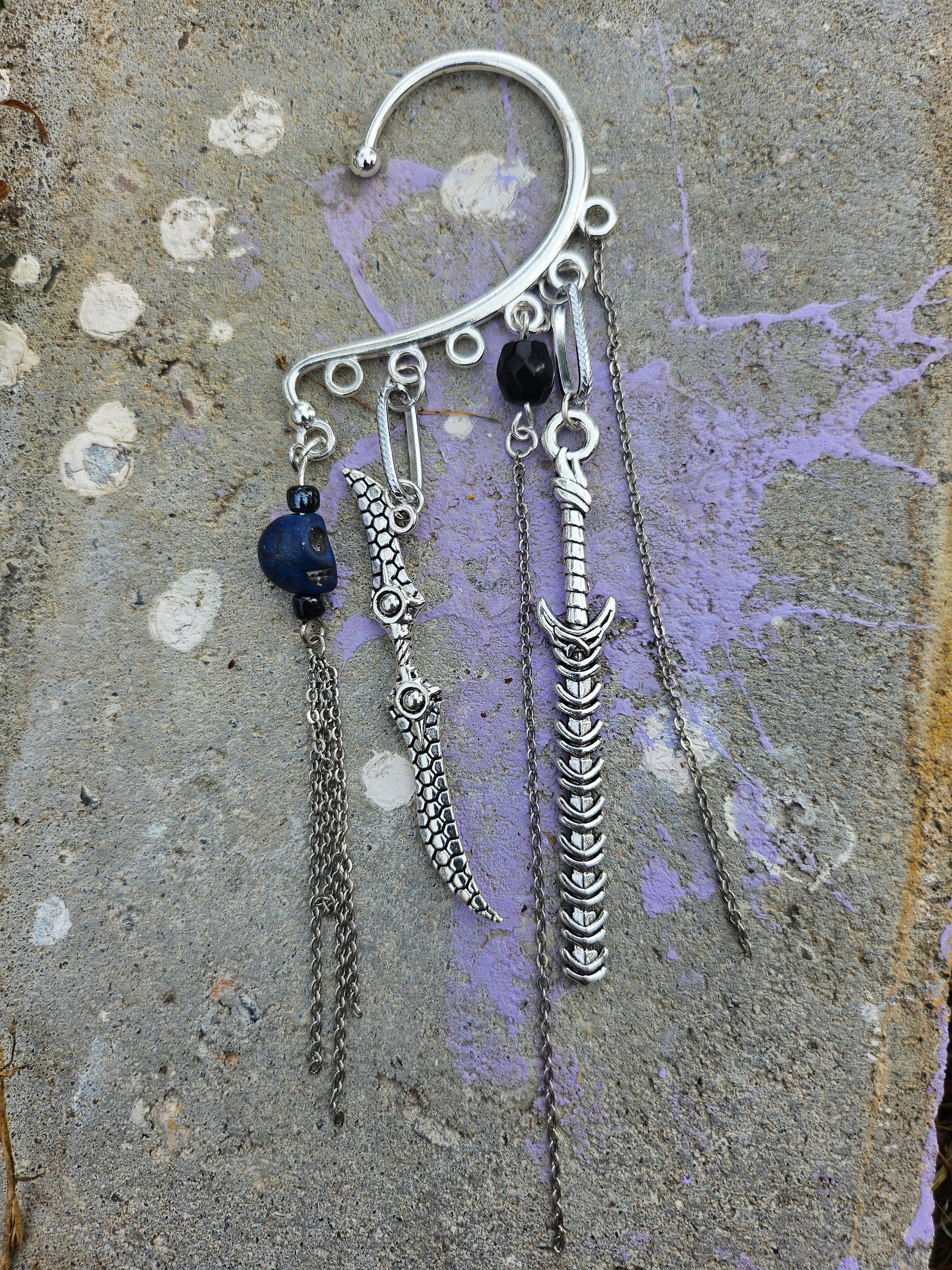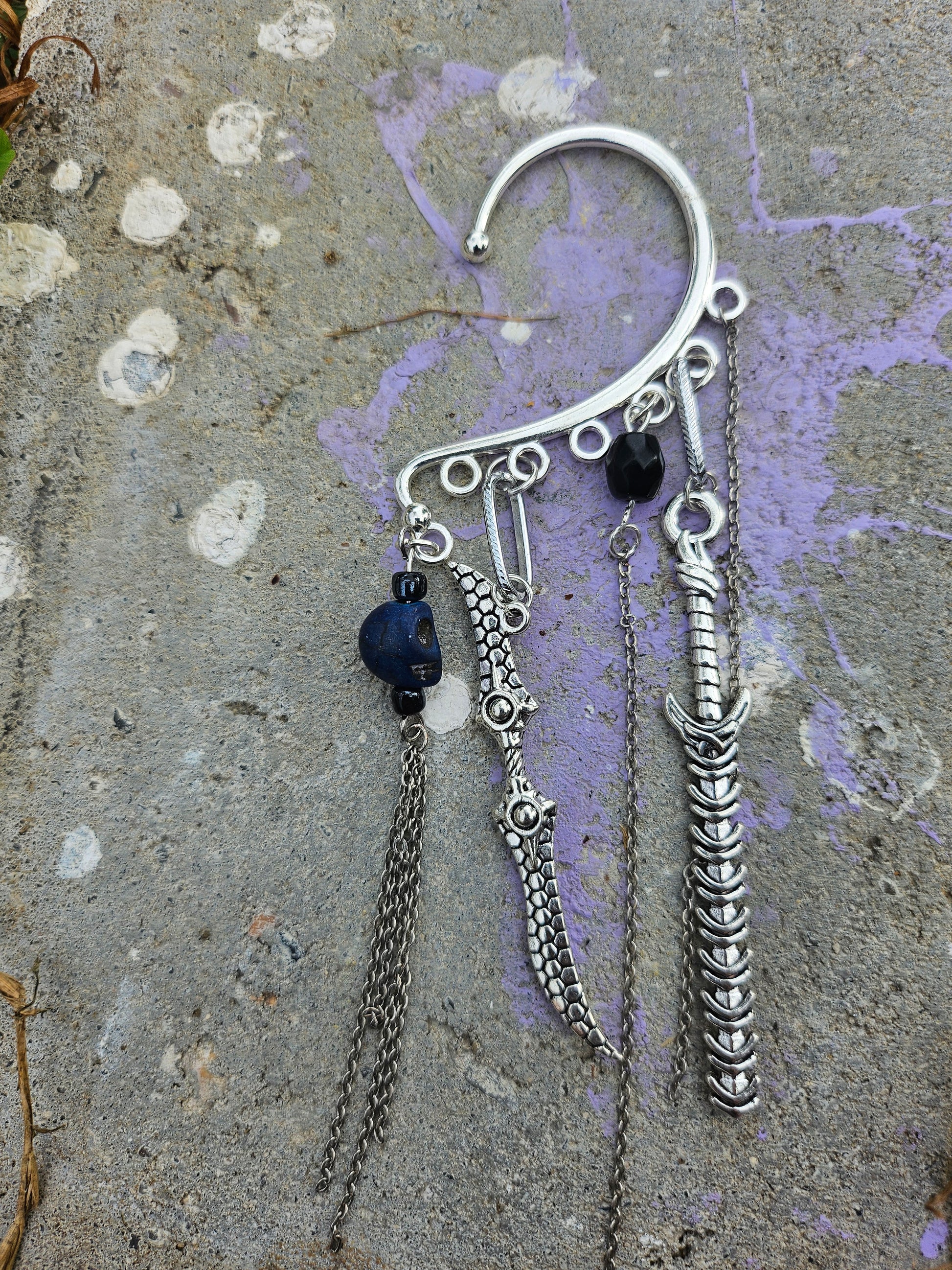 This ear cuff's base is silver. There is a blue skull bead, a few black beads, and two silver weapon charms. There are alsom metal chains.