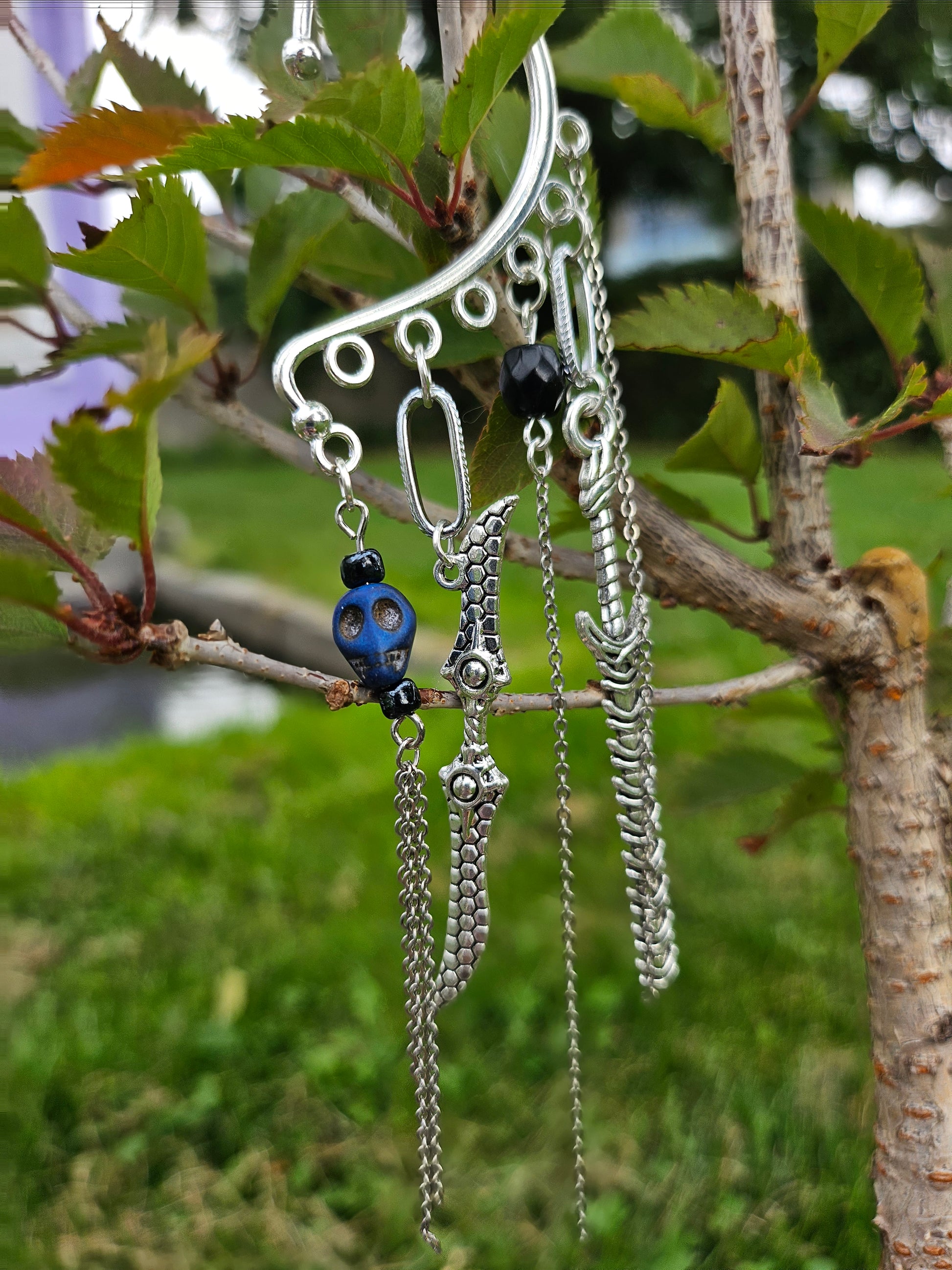 I wanted to make something a bit more extreme with some weapon charms and a blue skull bead. So this ear cuff was born.