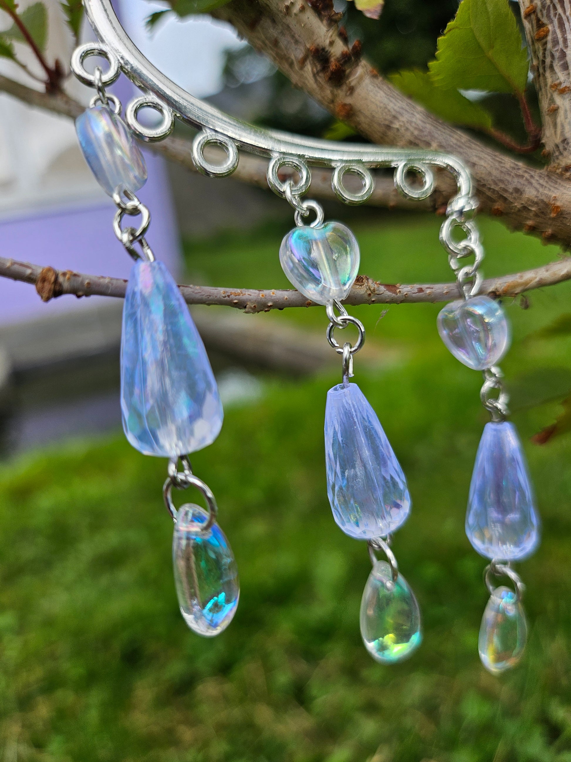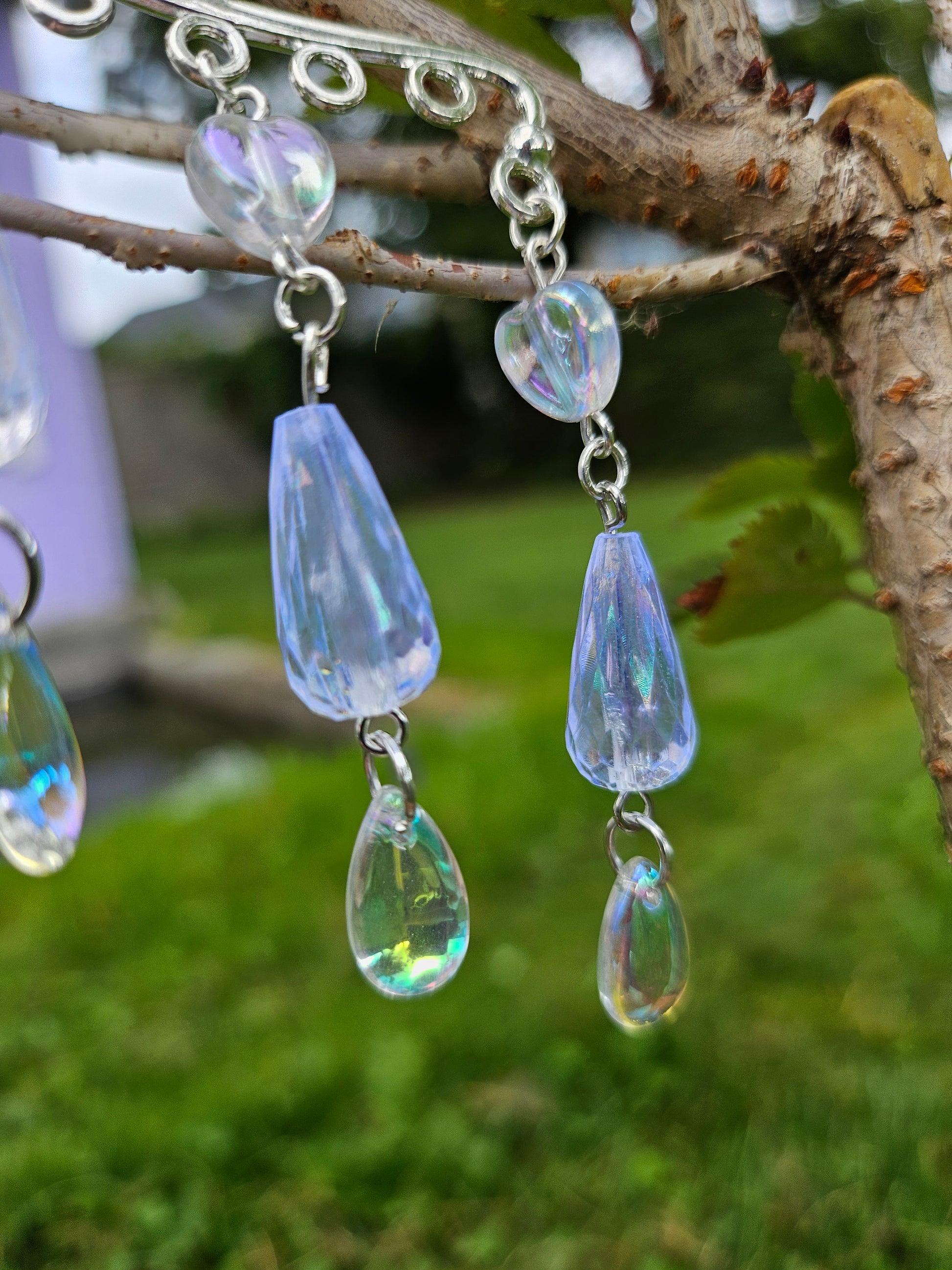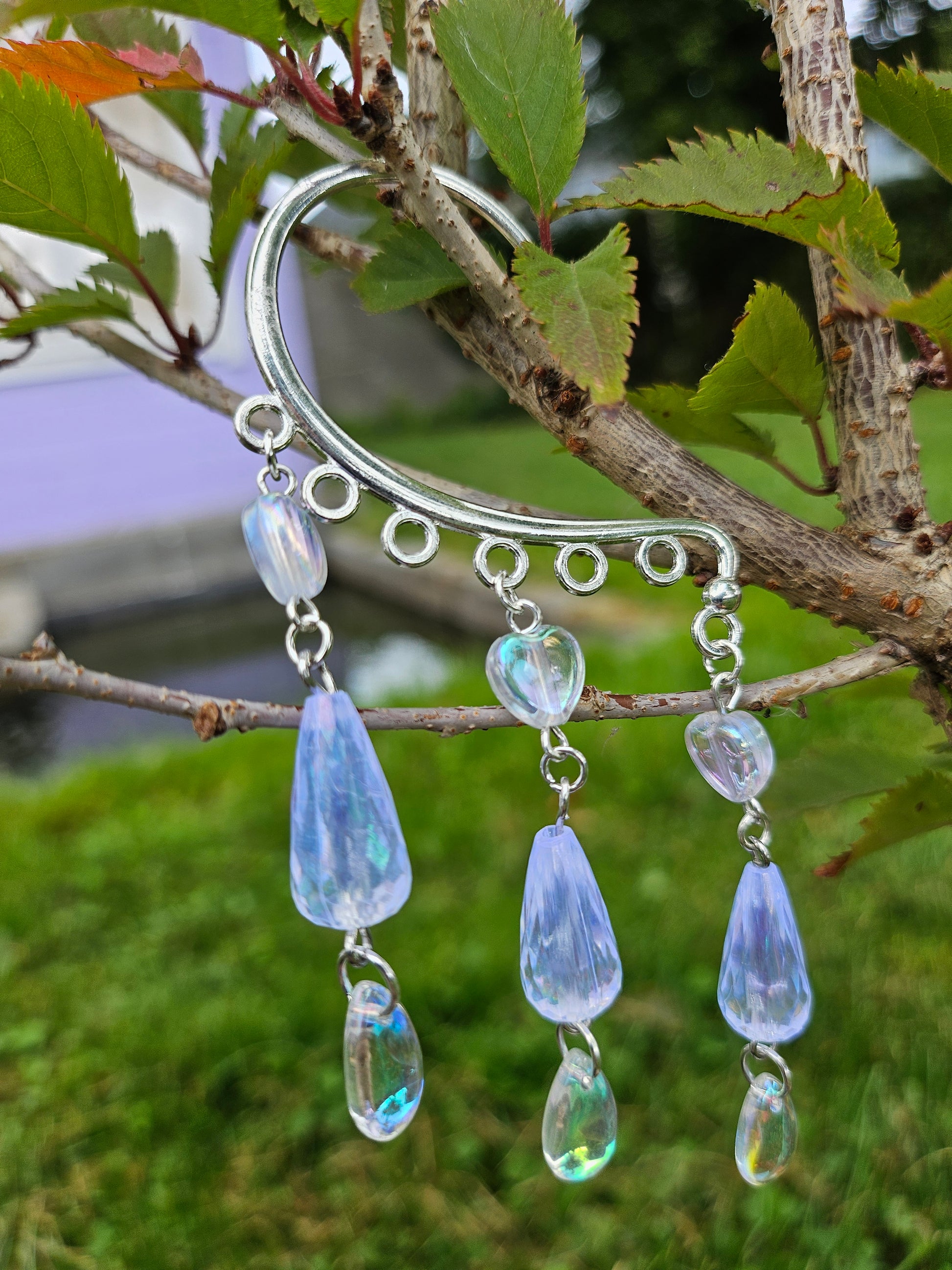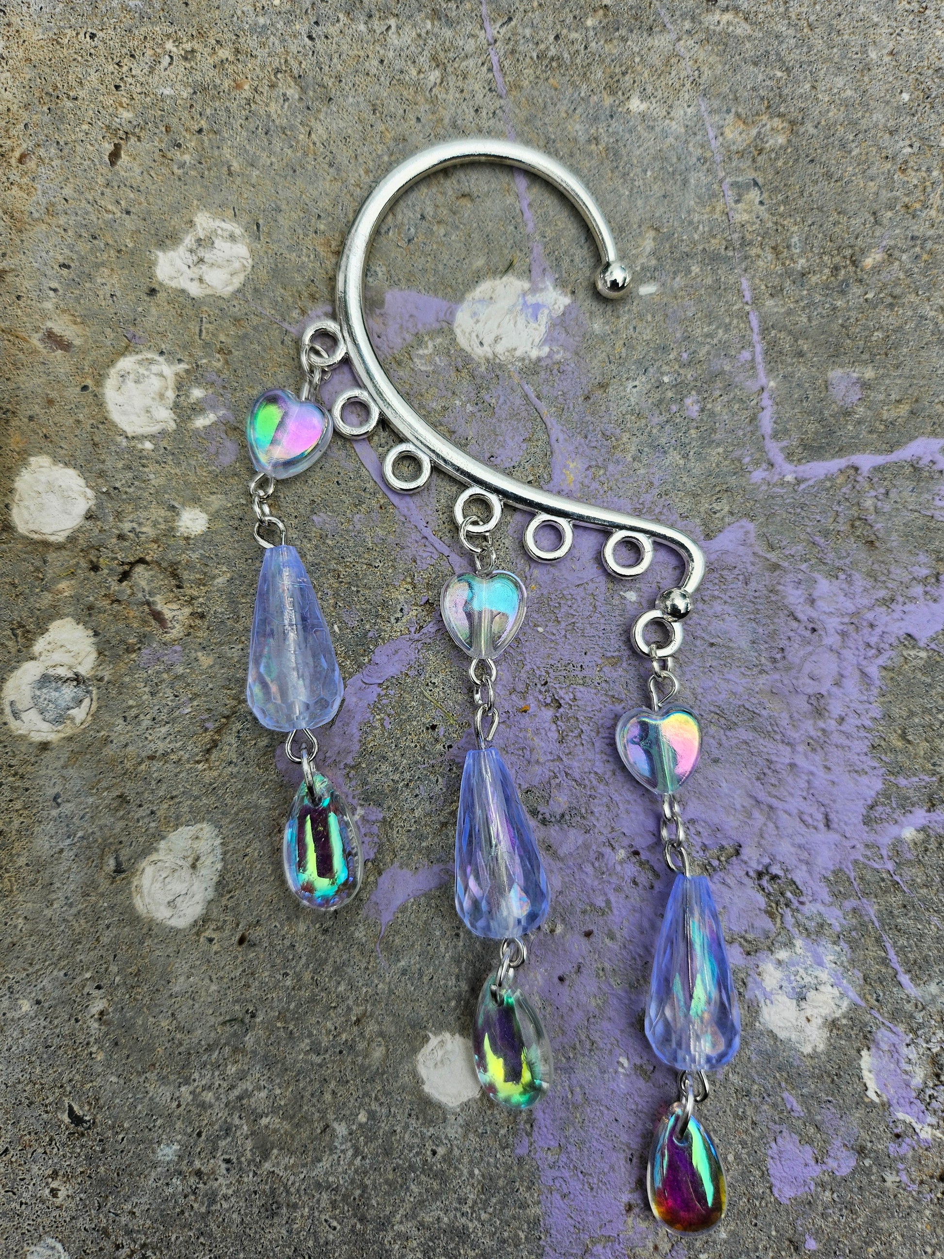 This ear cuff is a silver base with three hearts, droplet charms and long iridescent beads.