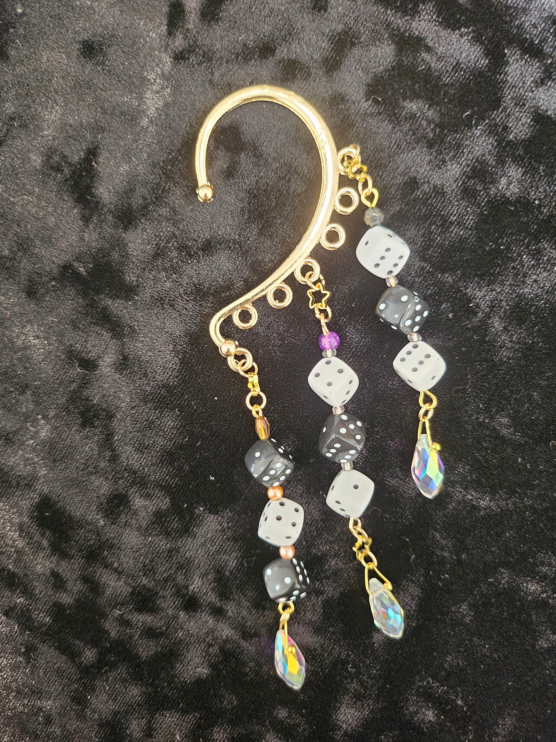 This ear cuff has a base of gold. There are 3 strands of hand-beaded eye-pins with alternating black and white dice. There are a variety of beads in between the dice. There are small star spacers with 3 iridescent crystals at the end.
