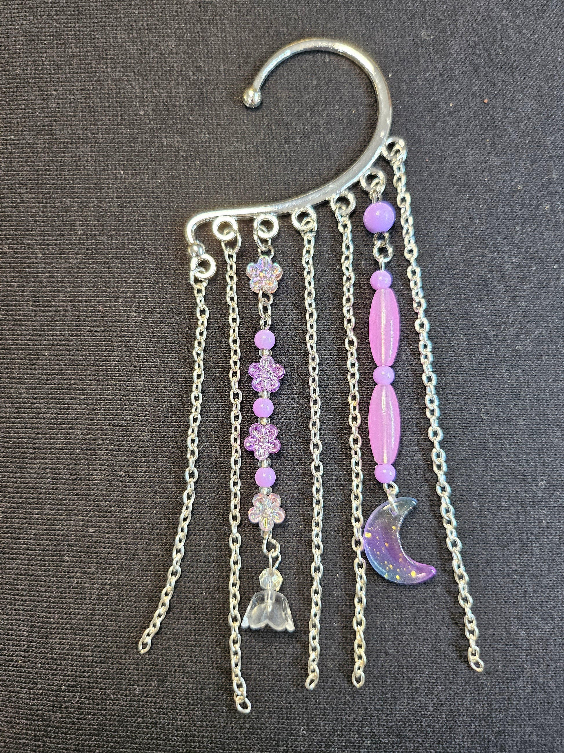 This ear cuff has a silver base. There are 5 long strands of silver chain. There are two hand beaded eye pin strands with a flower at the end of one and the other with a moon.