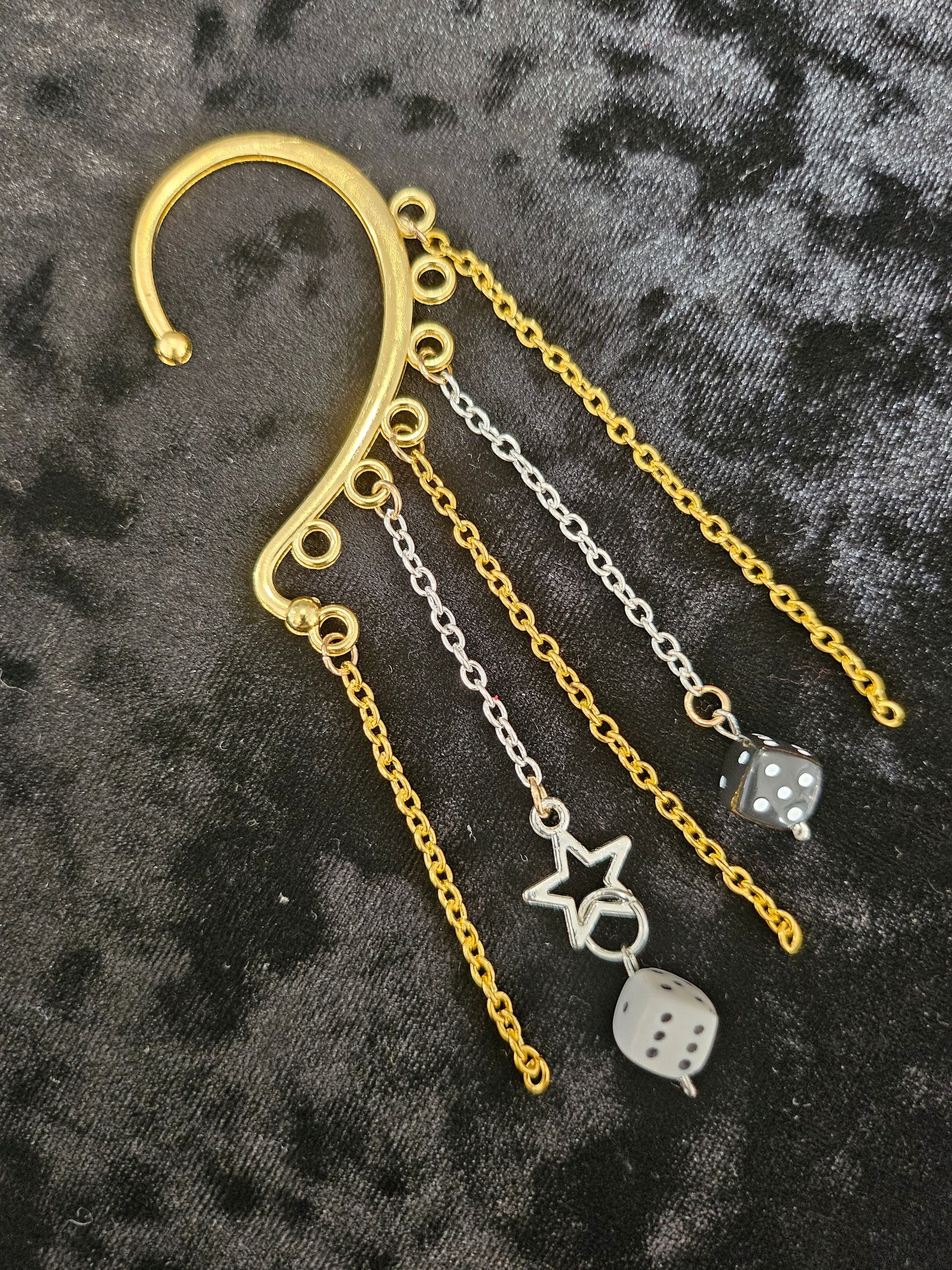 This ear cuff has a base of gold. There are several chain strands in gold and silver. There are two dice beads in contrasting black and white colors. There is a star charm in silver.