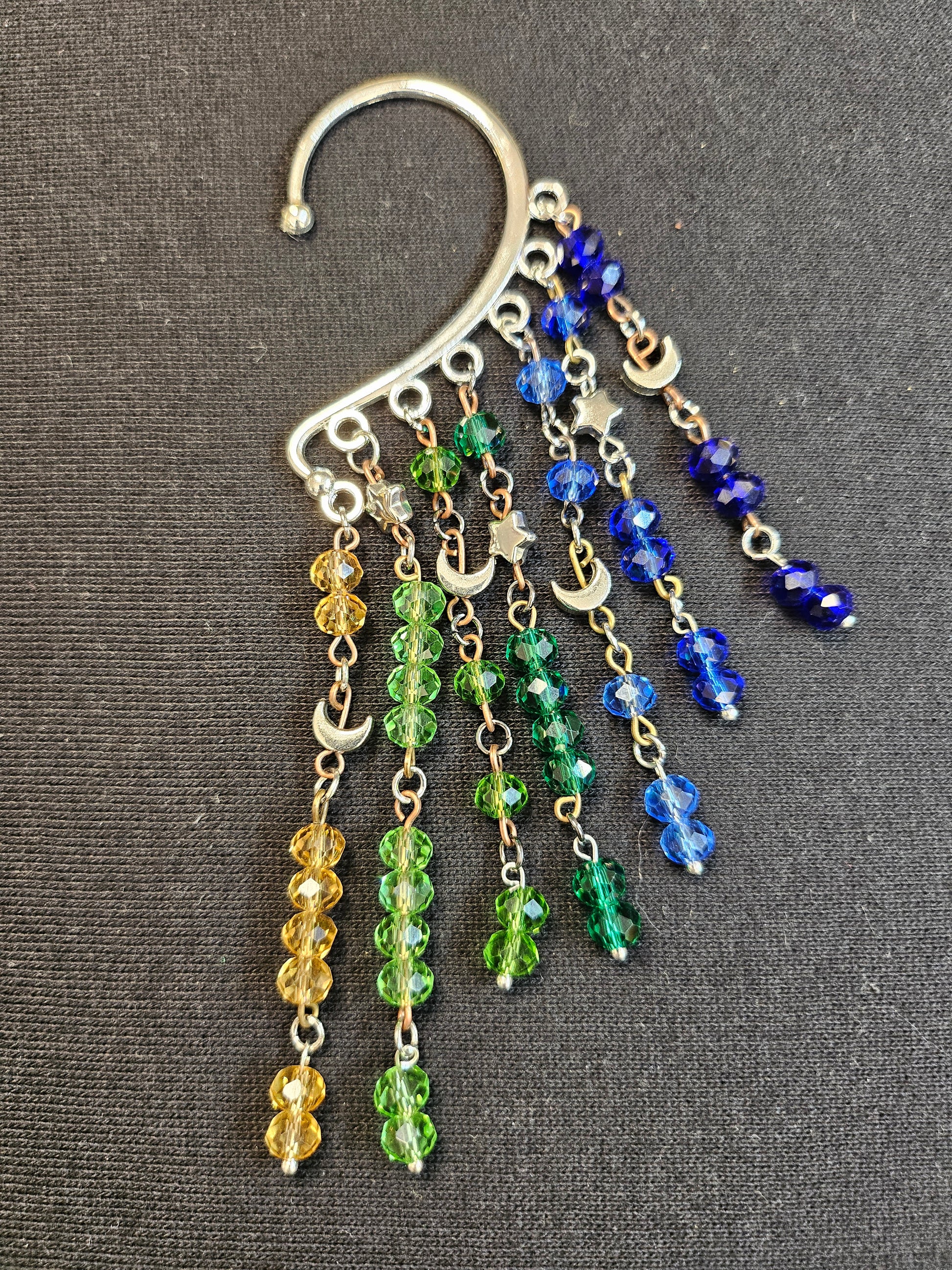 This ear cuff has a silver base. There are 7 hand-beaded eye-pins starting in navy to yellow. To help break up some of the blocks of color are moon and star beads in silver.