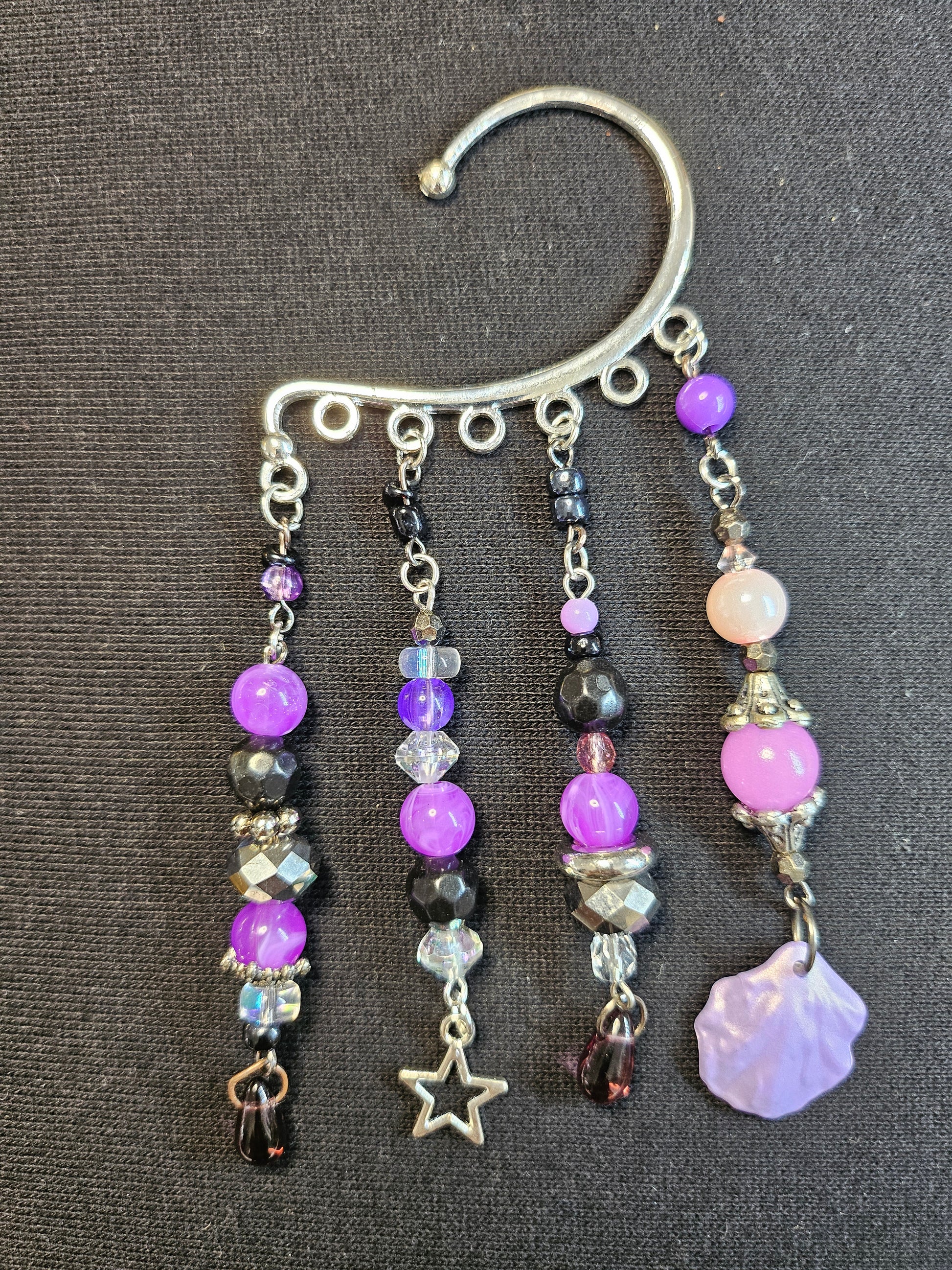 This ear cuff has a silver base. There are 4 hand-beaded eye-pin strands with black and various shades of purple. There are two dark purple droplets, a star charm, and a shell leaf charm at the end of the beaded strands.