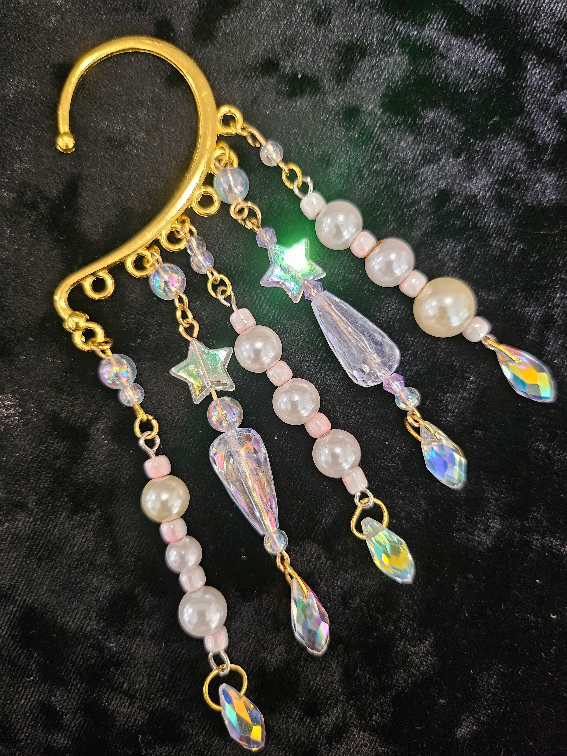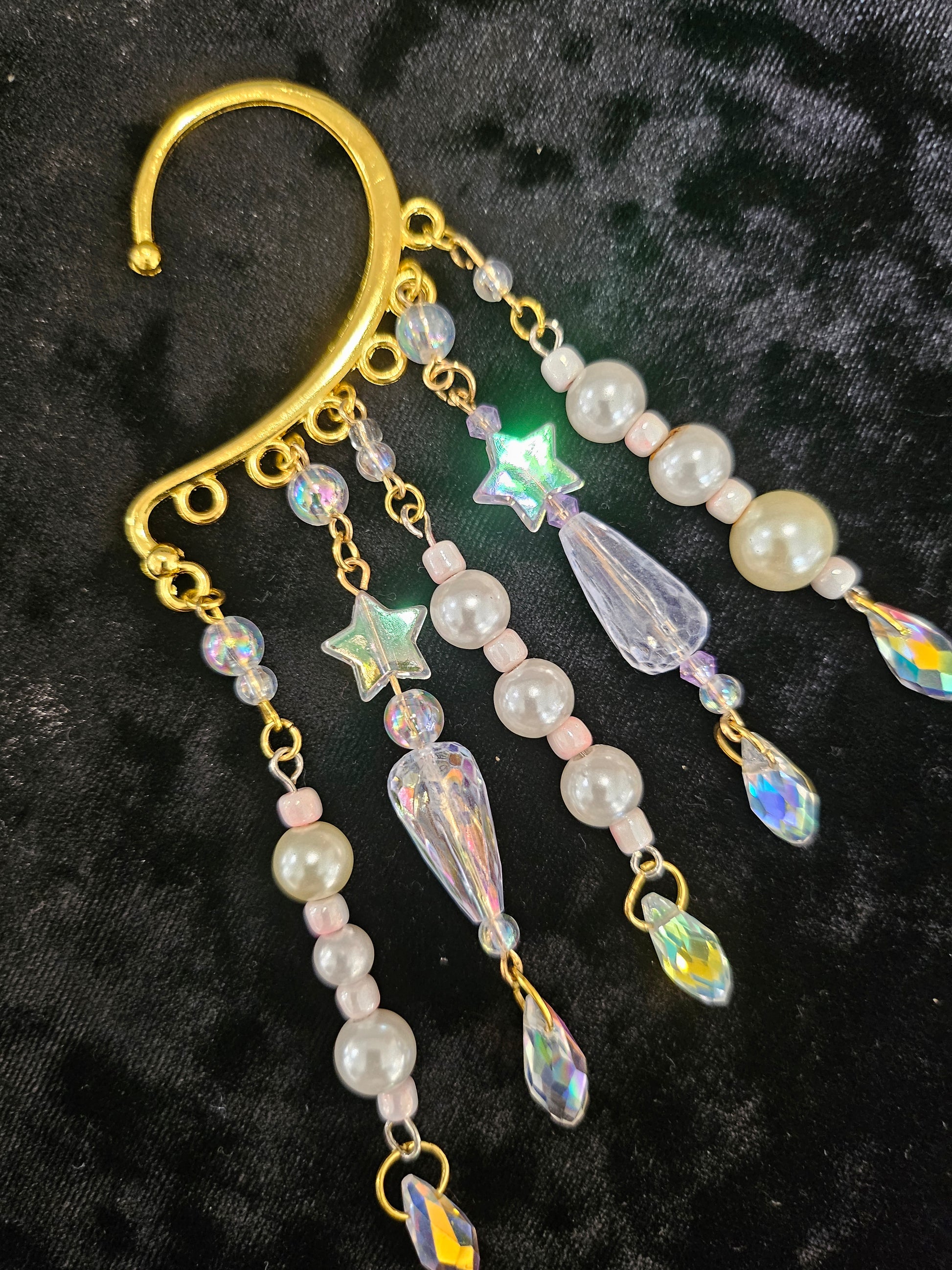 This ear cuff has a base of gold. There are 5 hand-beaded strands in total. All strands have iridescent crystals at the end. Three strands have pearl motifs, and two strands have iridescent stars and beads.