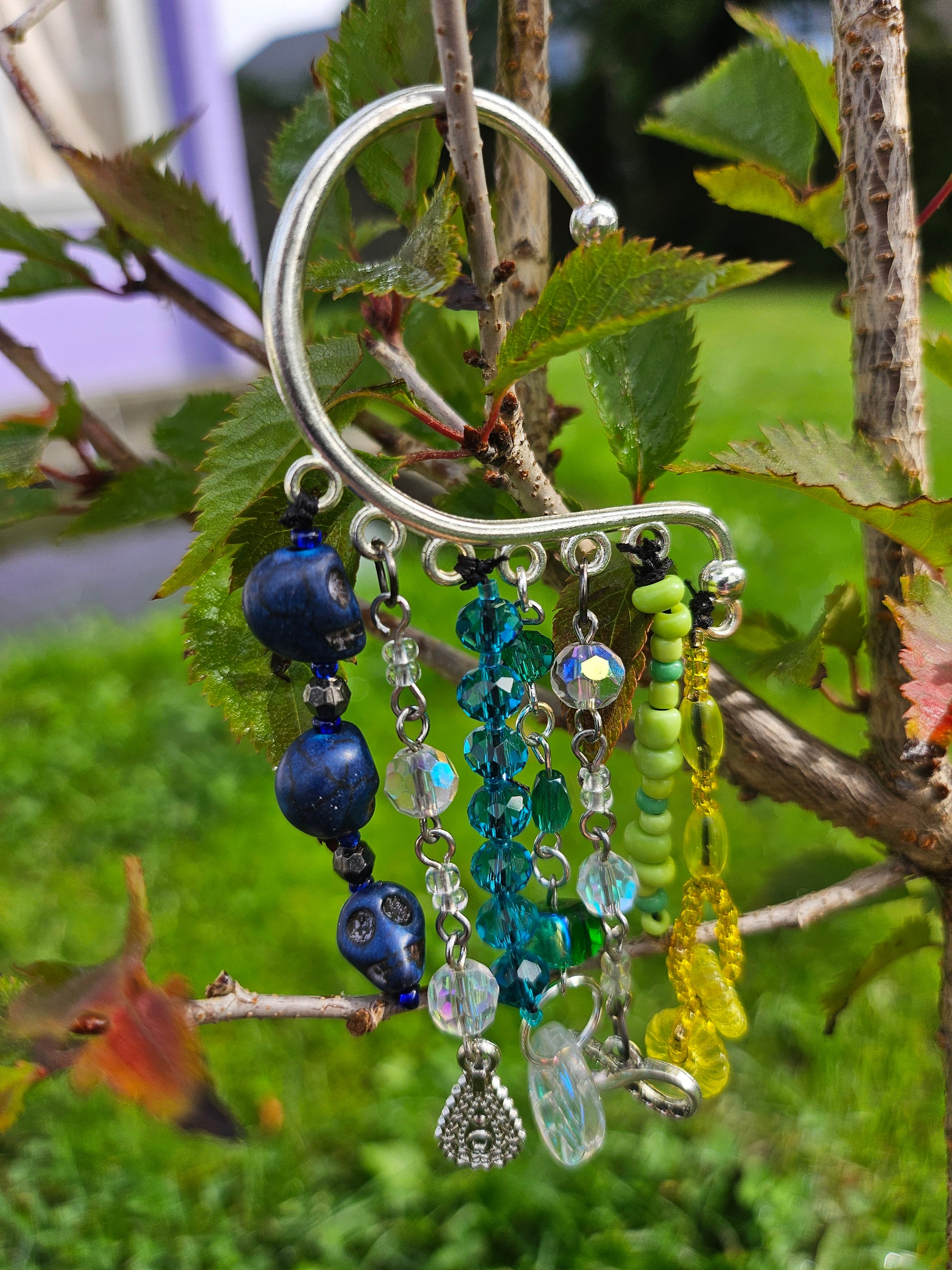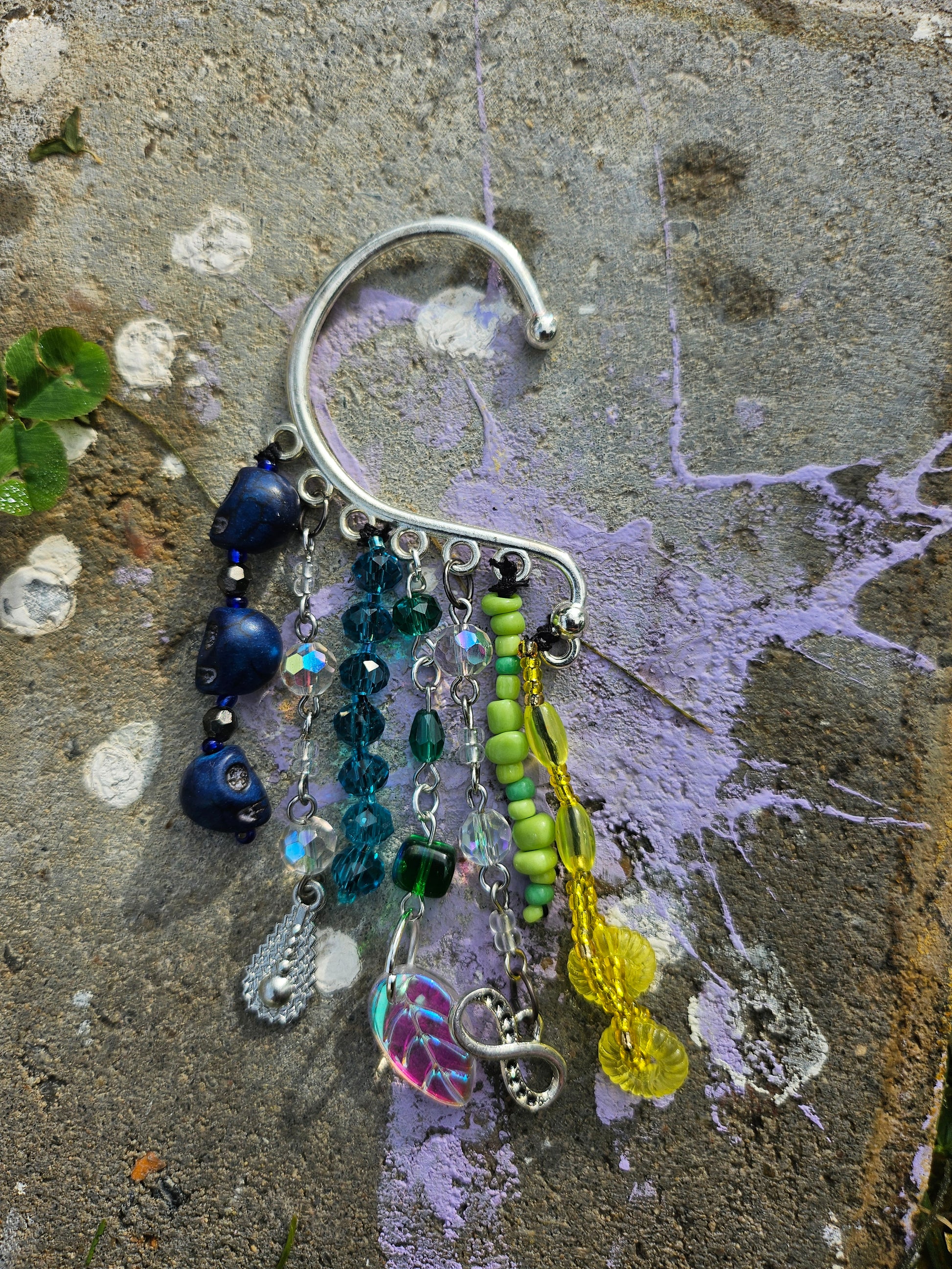 This ear cuff has a silver base. The base metal is a mixed alloy coated in silver. Various beads, charms, and chains were used to create this ear cuff.