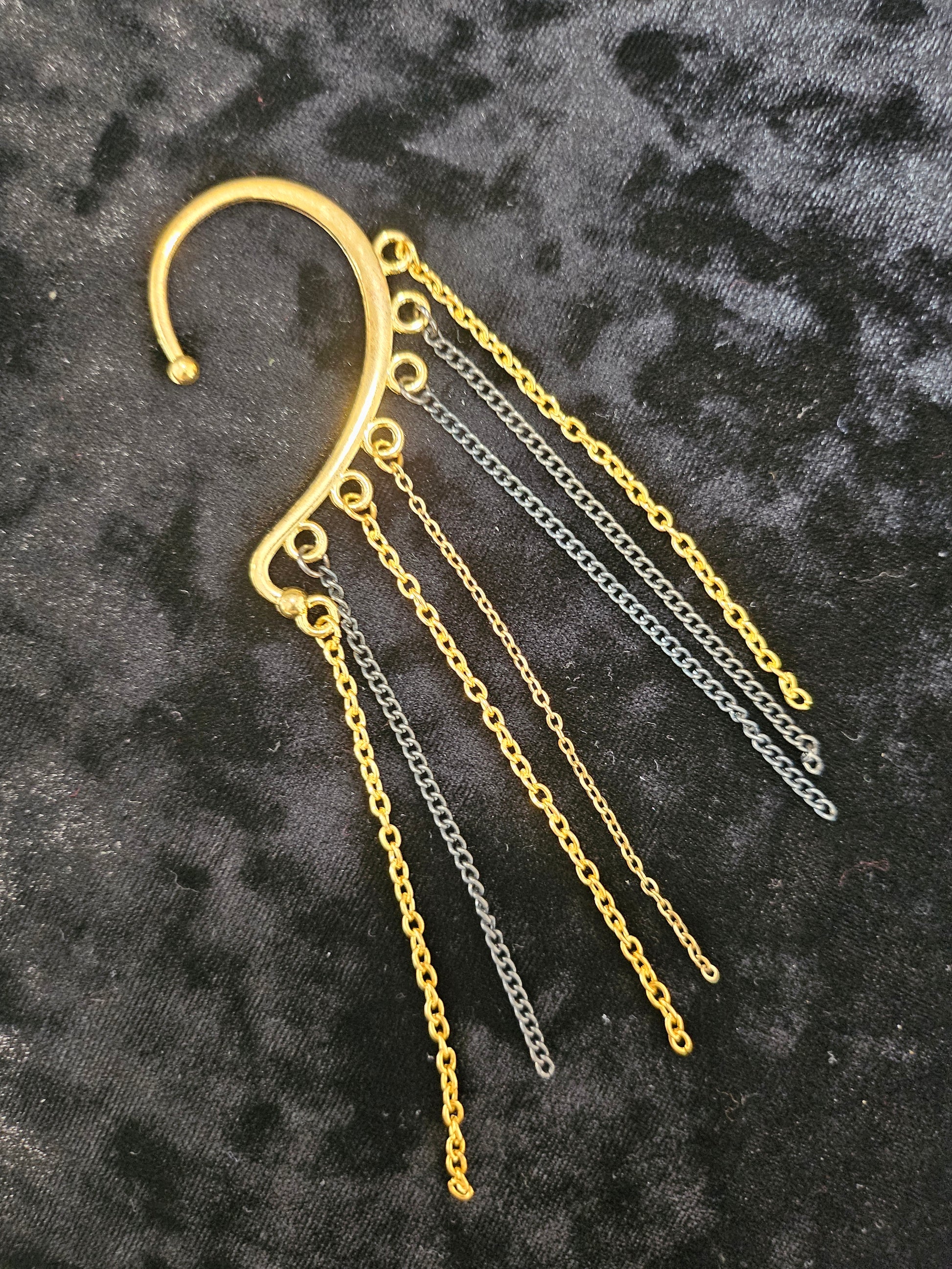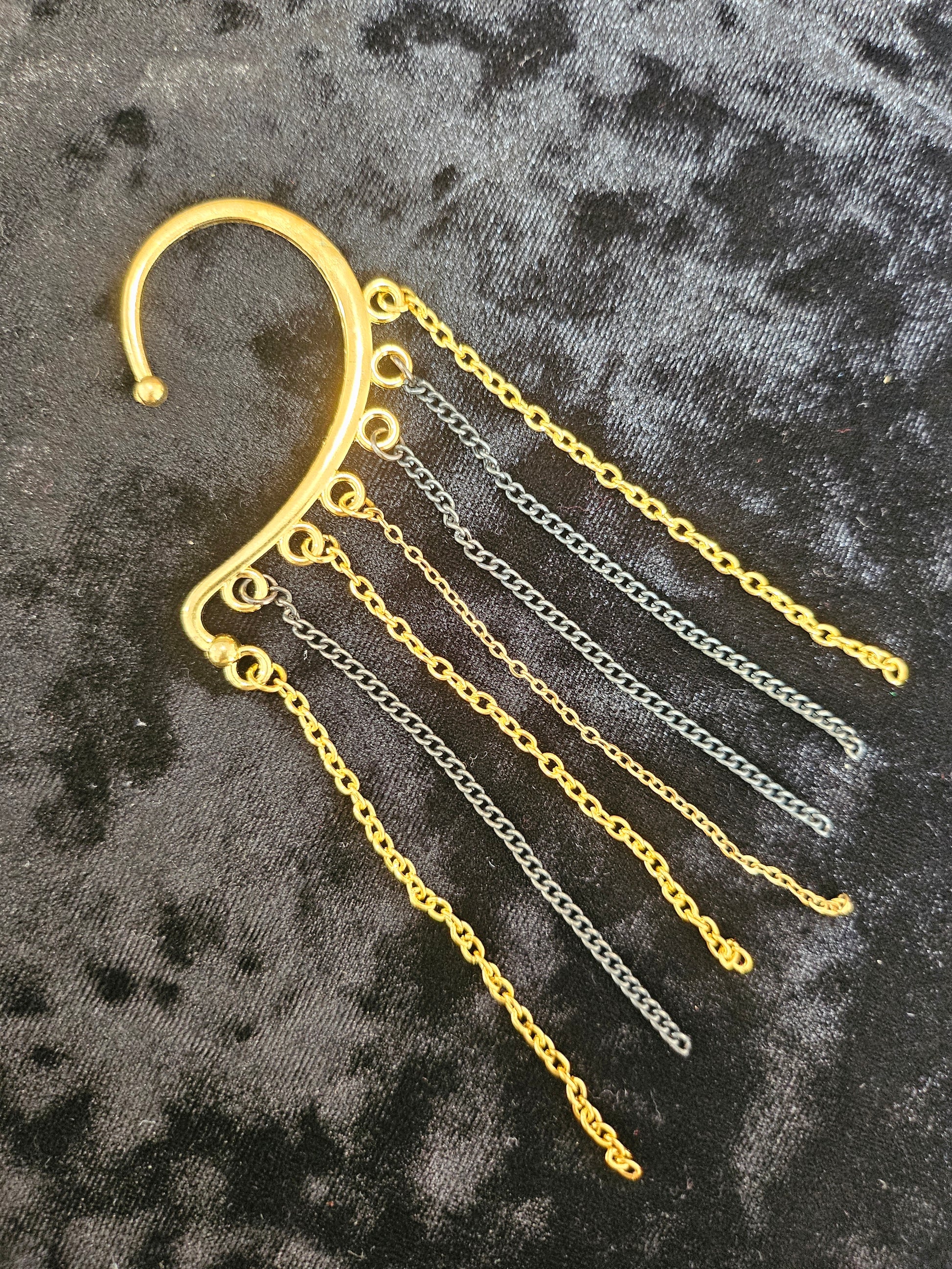This ear cuff has a base of gold. There are several chain strands in gold and black.