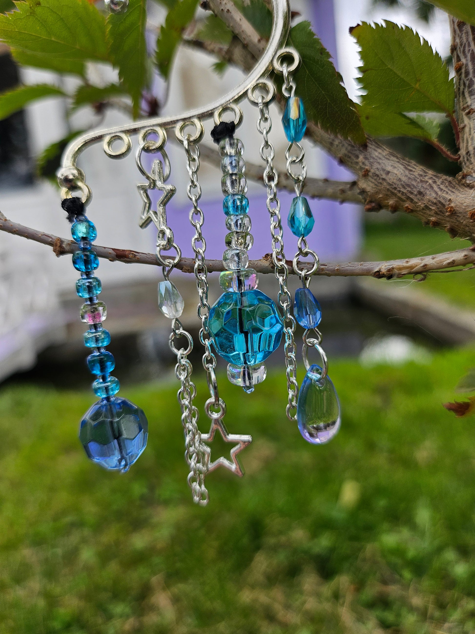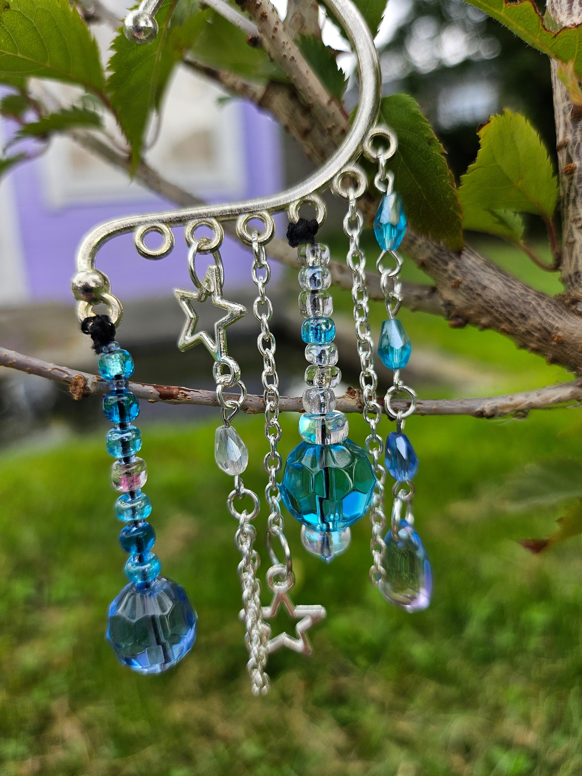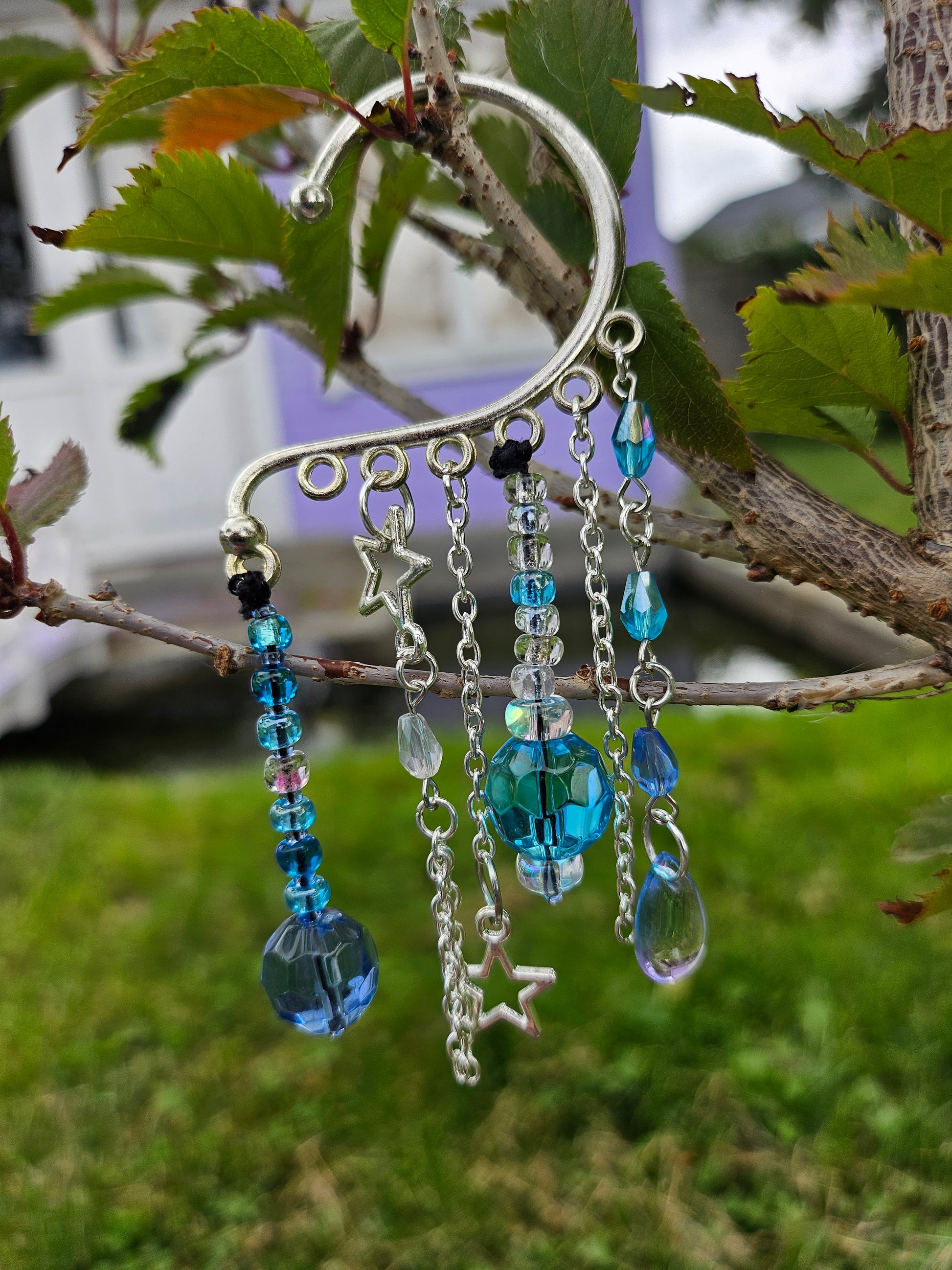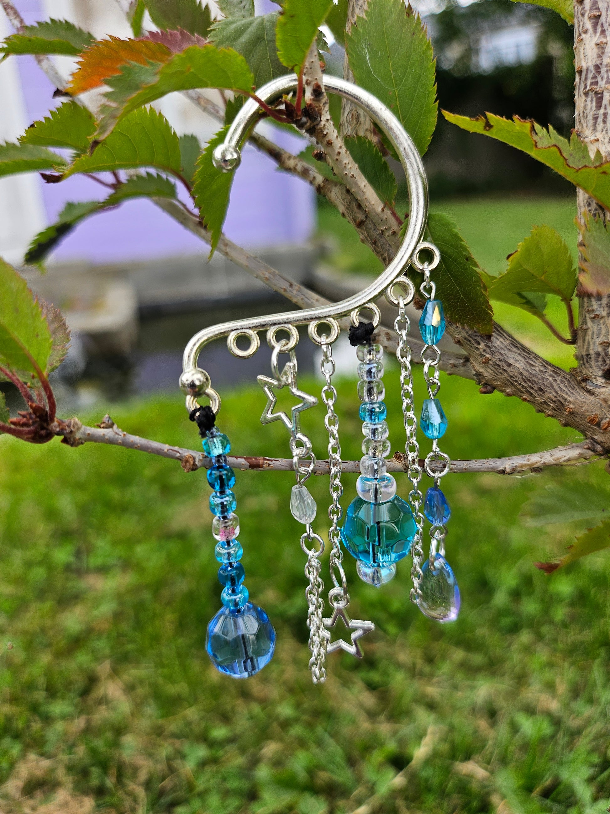 This ear cuff's base is silver. It has silver chains with metal star charms and an array of glass and acrylic beads in shades of blue.