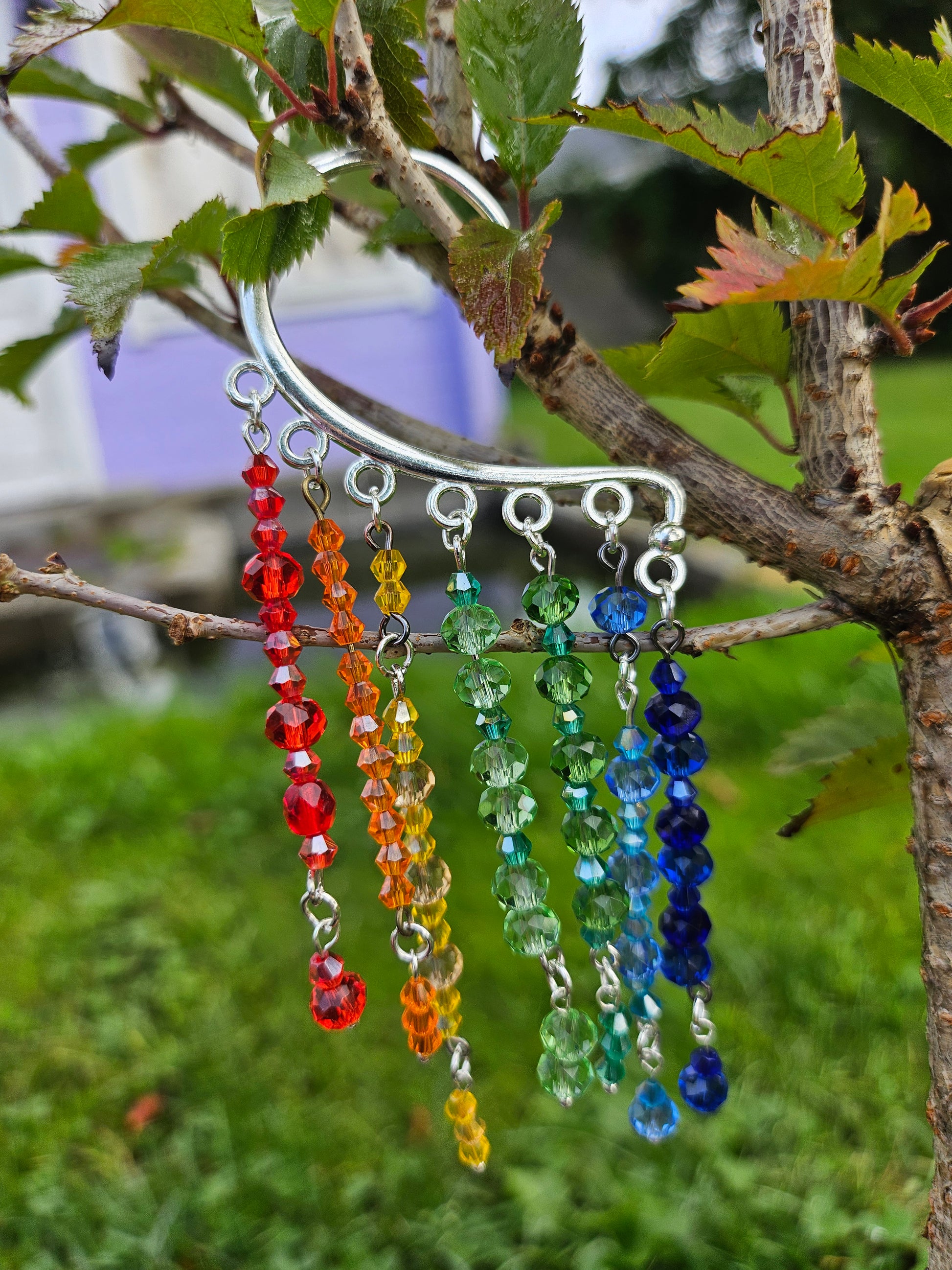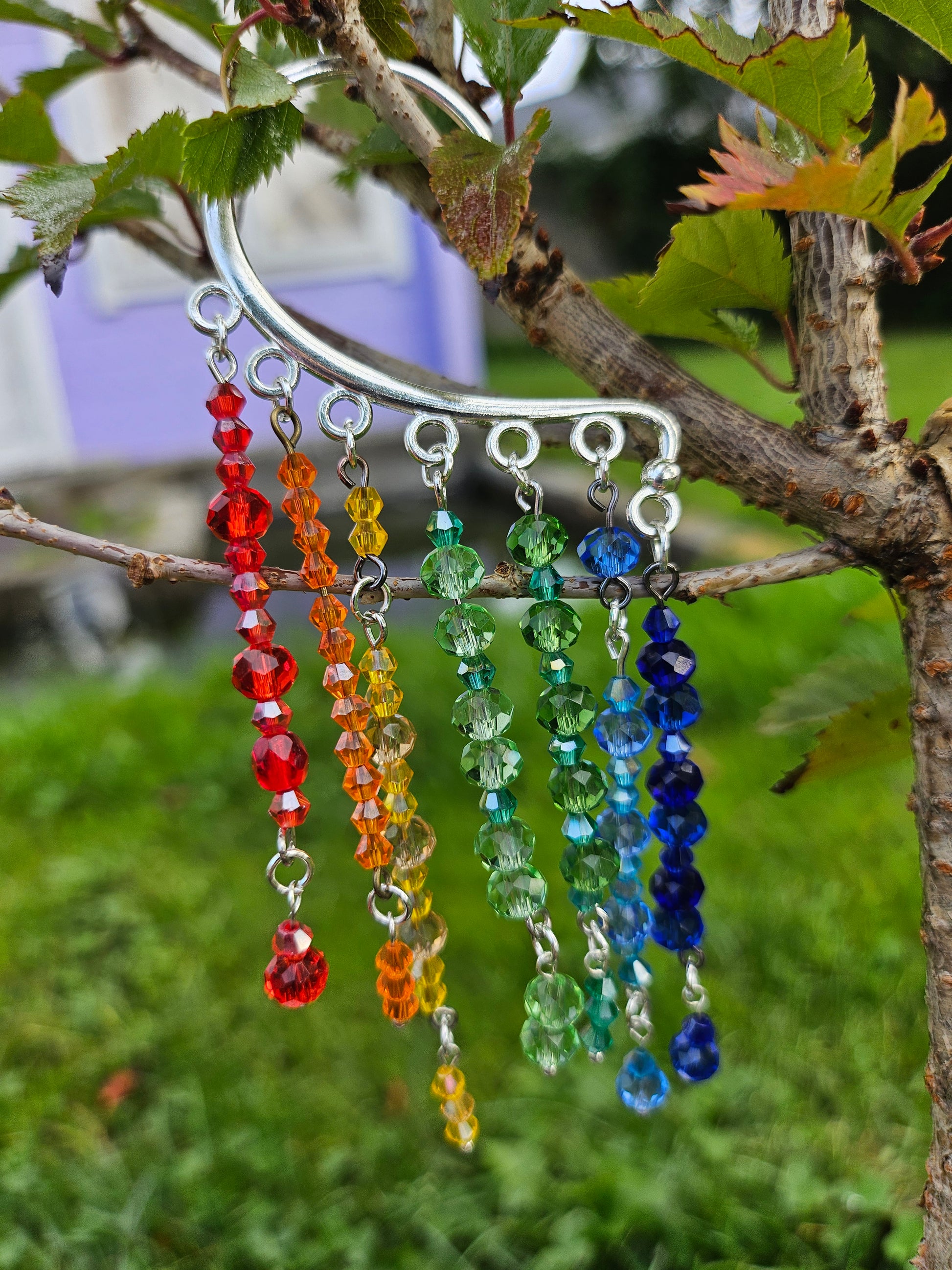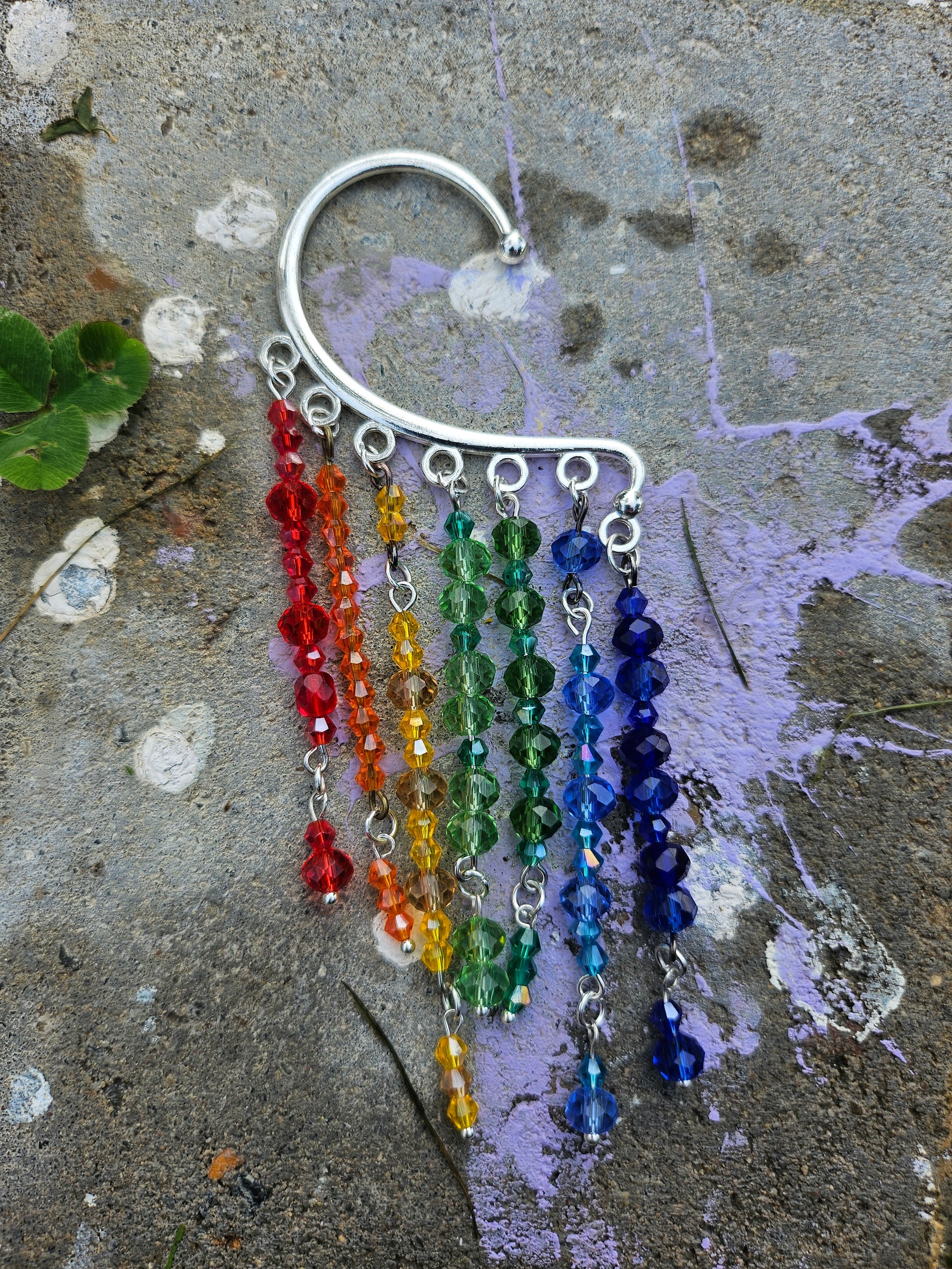 When I made this ear cuff, I was watching a kid's tv show where they were talking about raindrops and refractions. I really wanted to have a rainbow ear cuff. So I made this one.