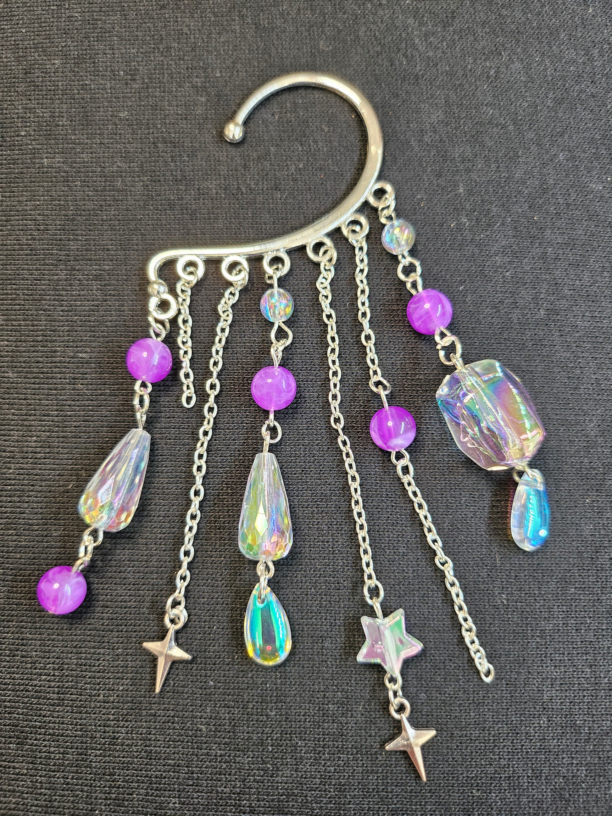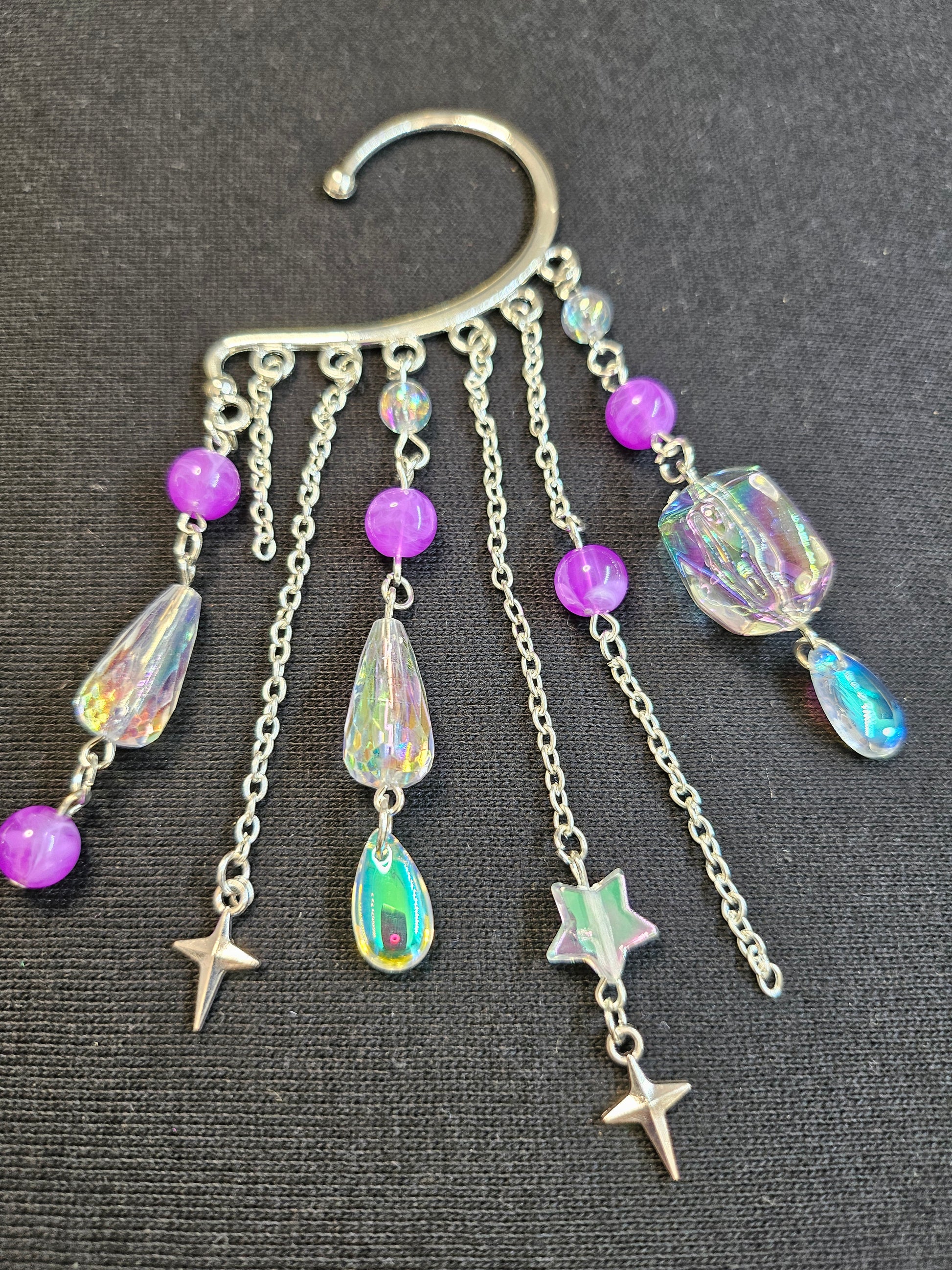 This ear cuff has a silver base. There are four beaded strands of purple beads with long iridescent beads with drops at the ends. There are other silver strands with beads and charms on them.