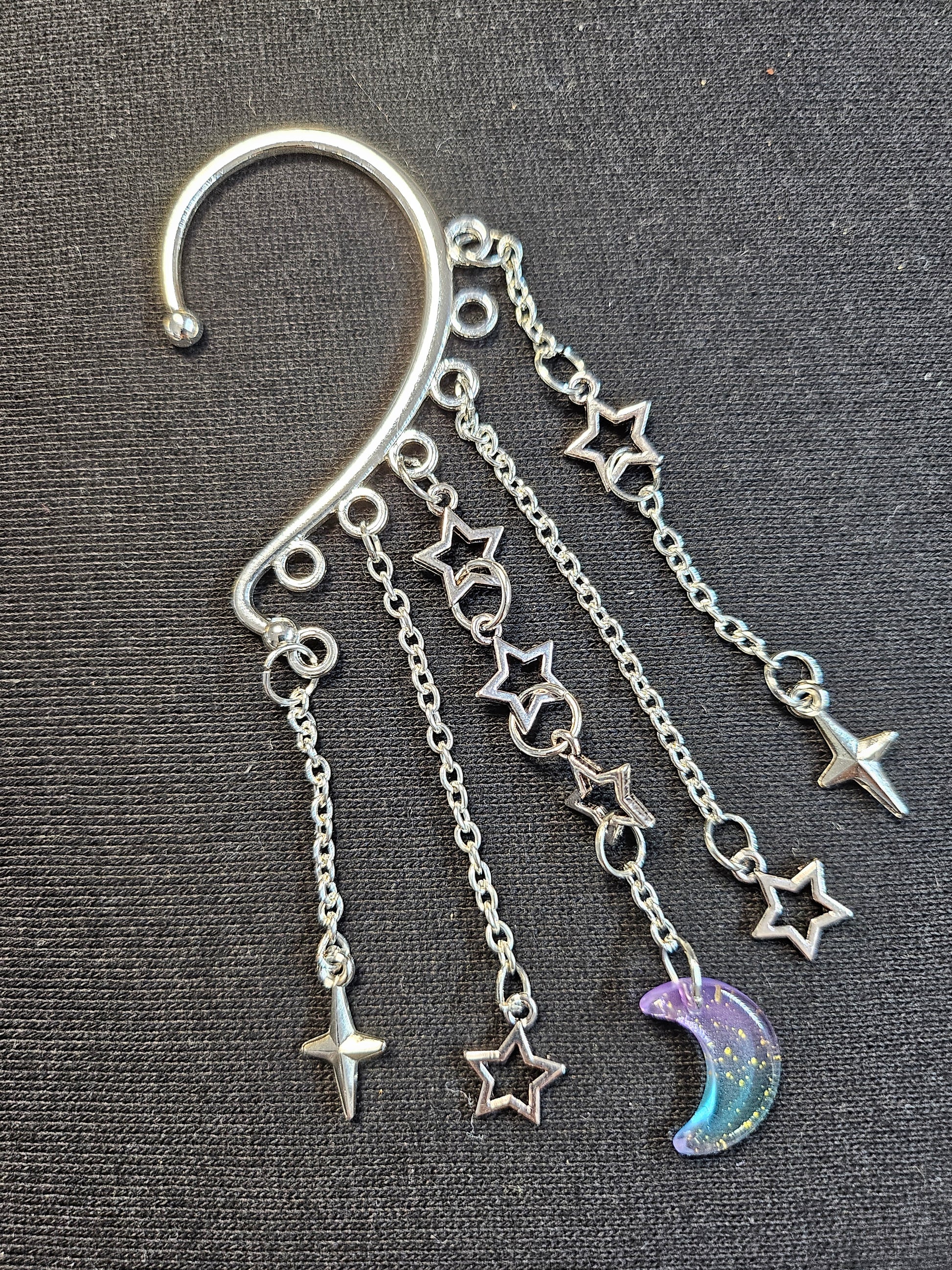 This ear cuff has a base that is silver. There are 5 silver strands with stars, and 1 glass moon.