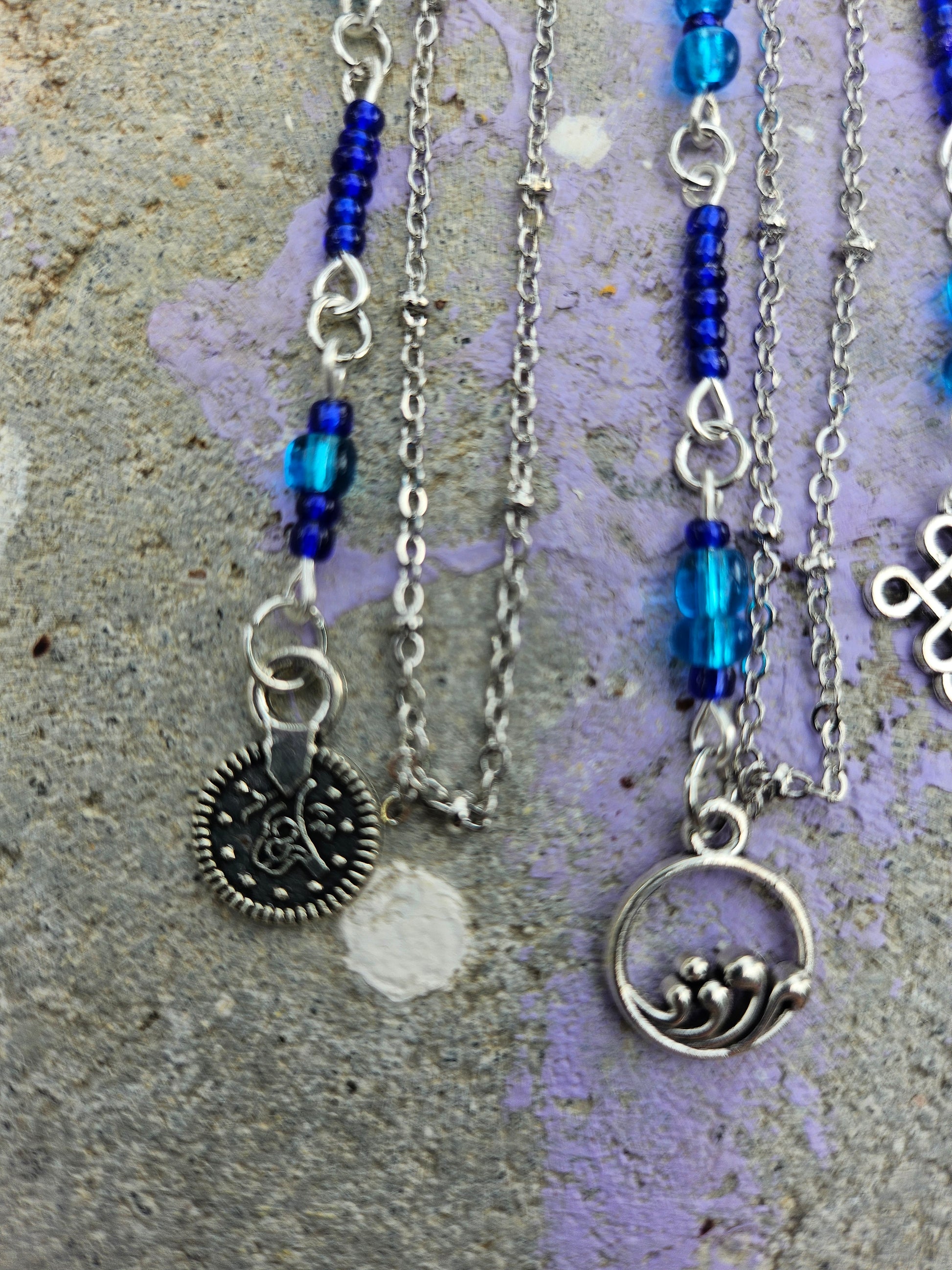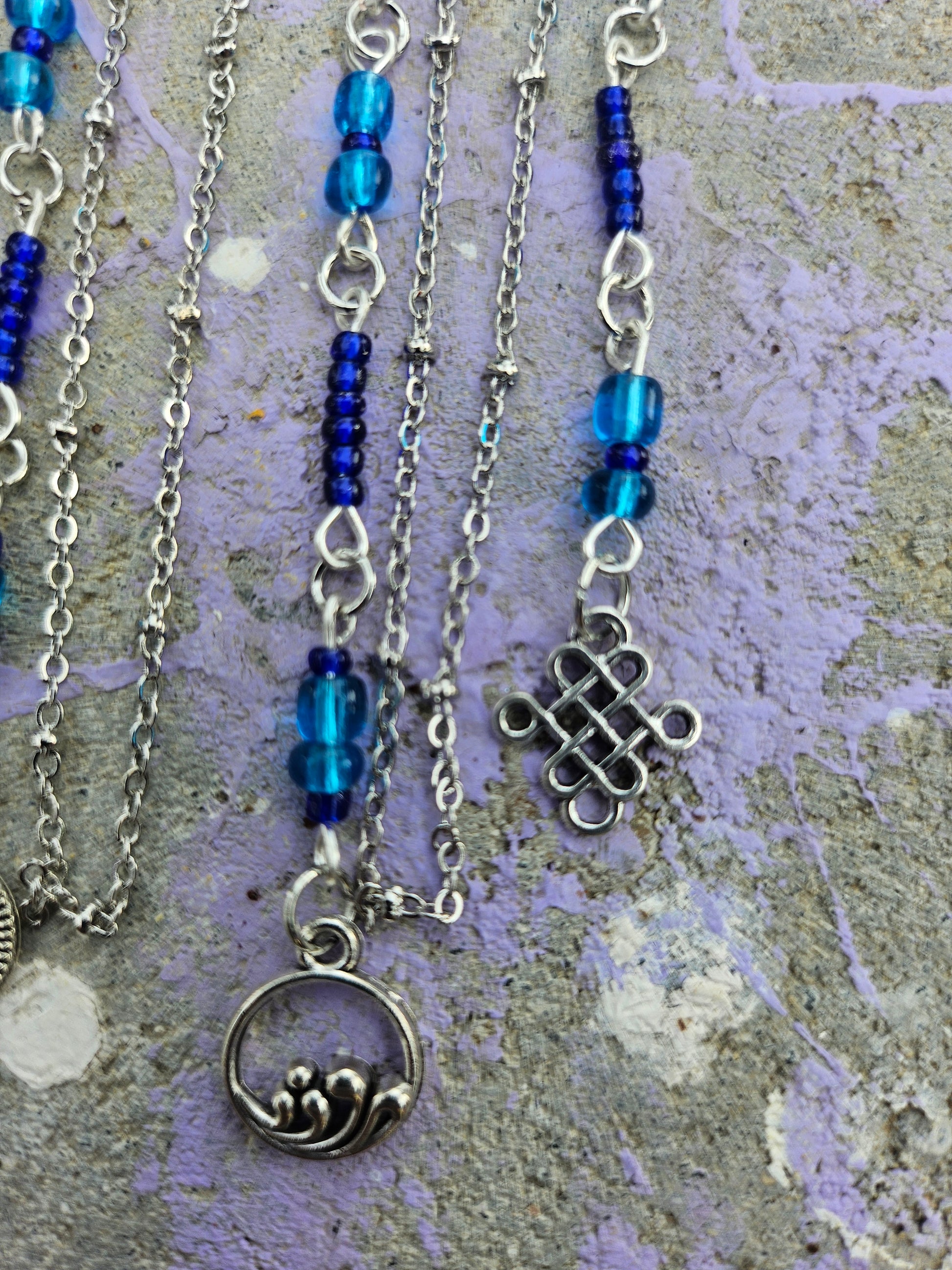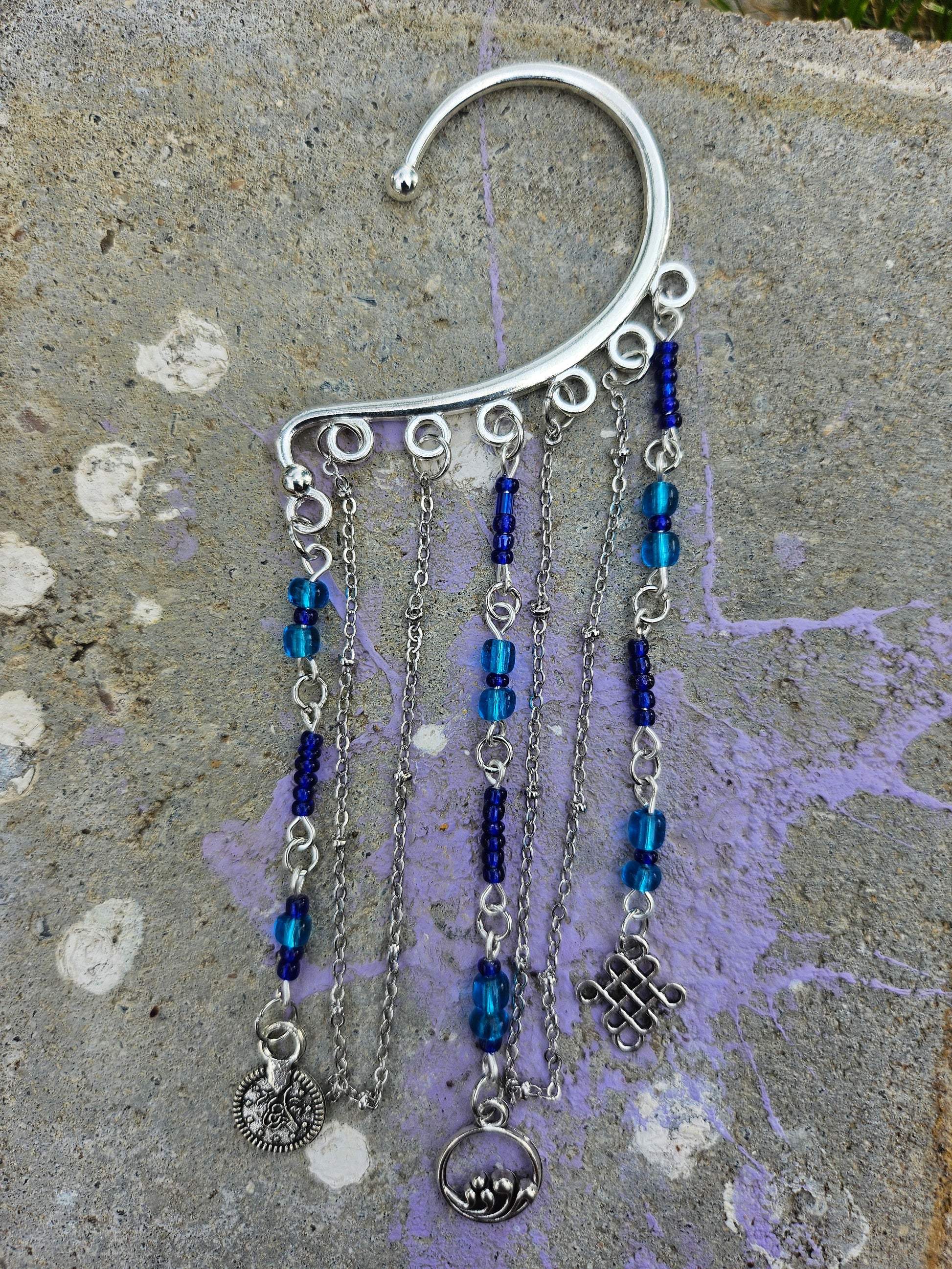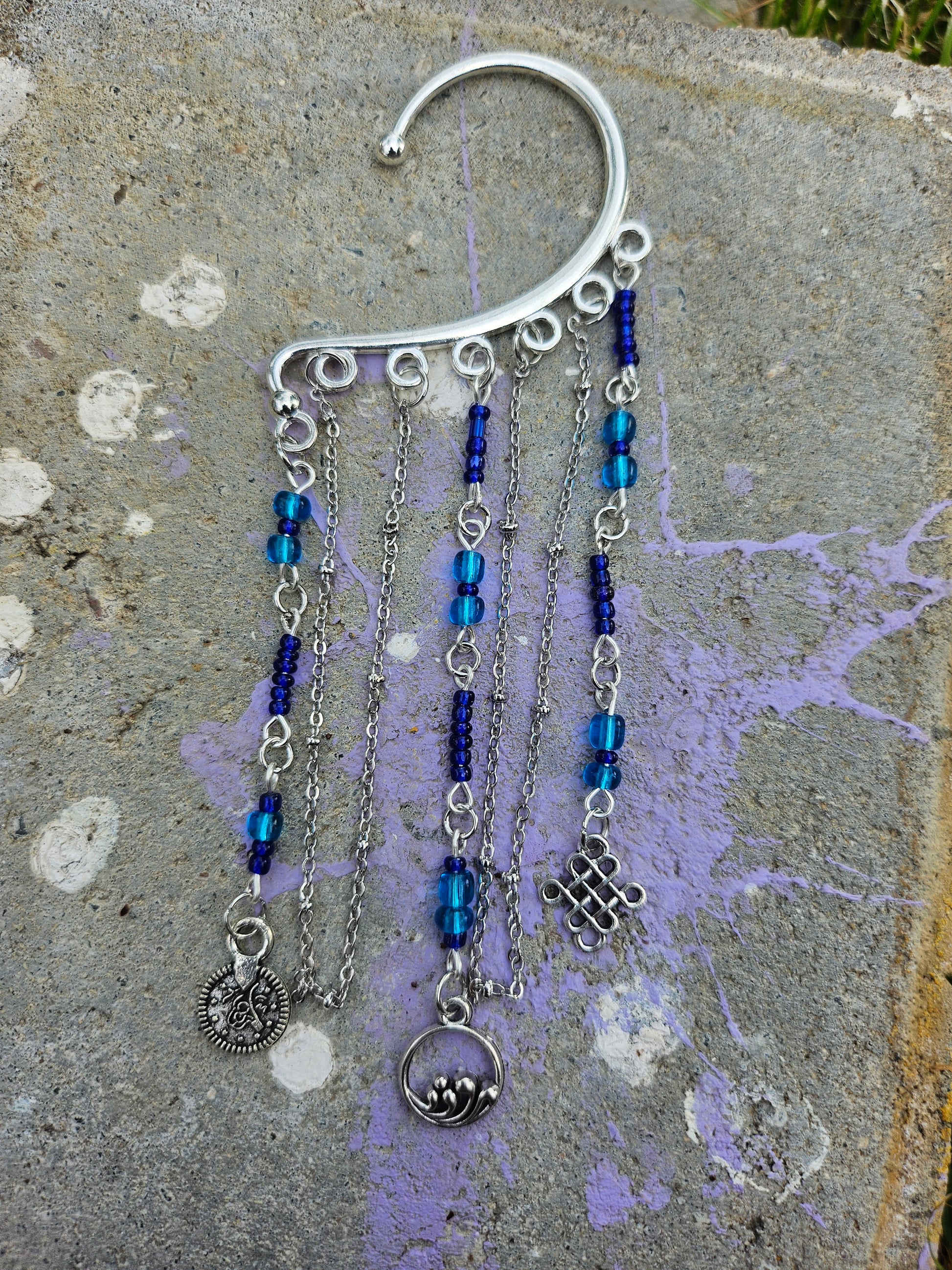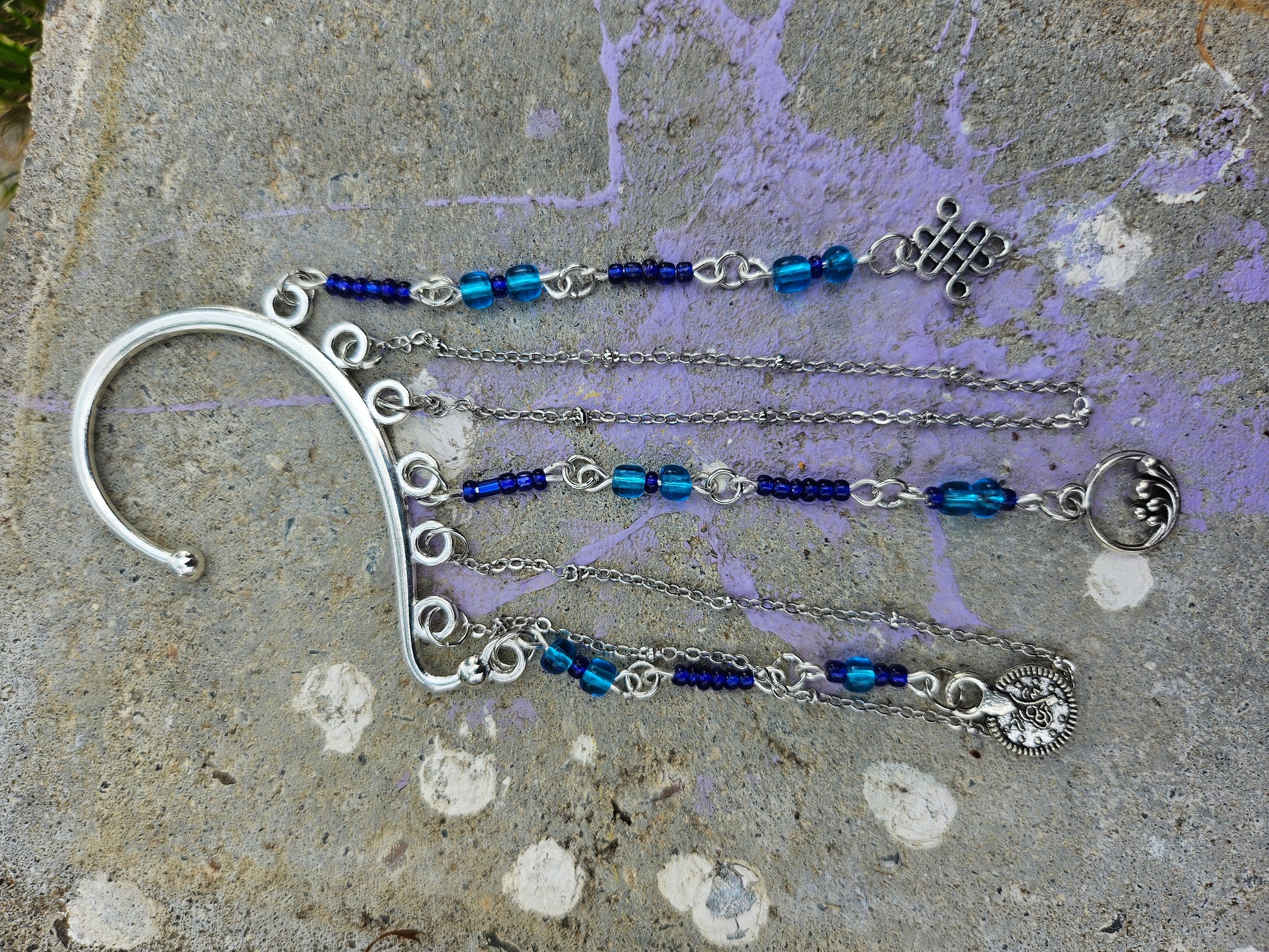 This ear cuff's base is silver. There are silver metal chains. Three unique charms with various colors of blue beads/