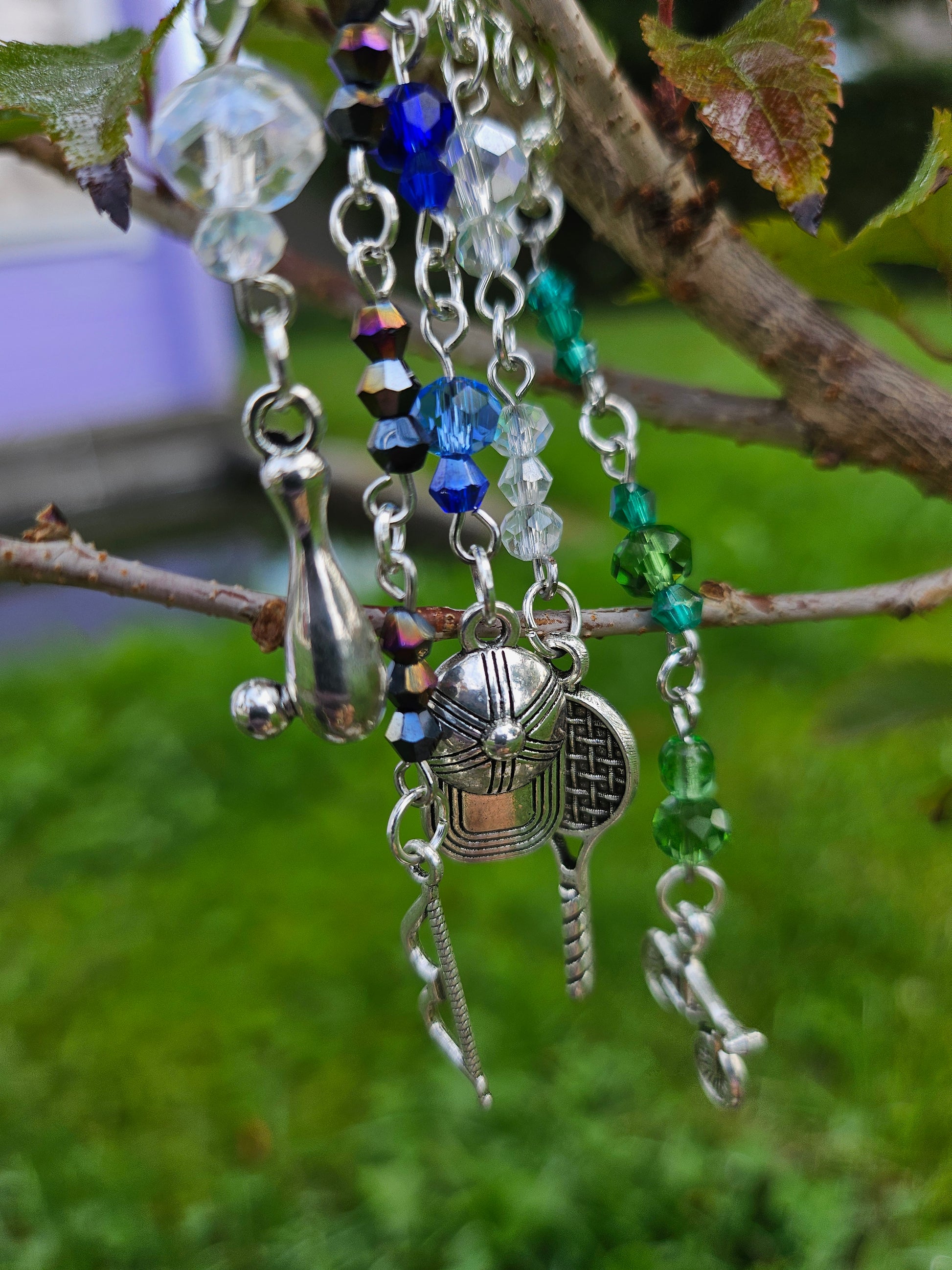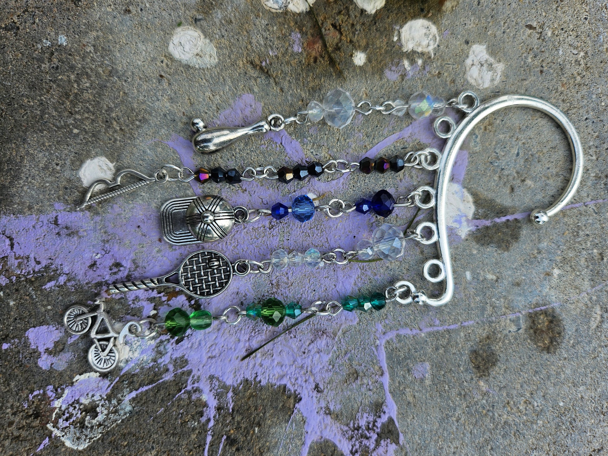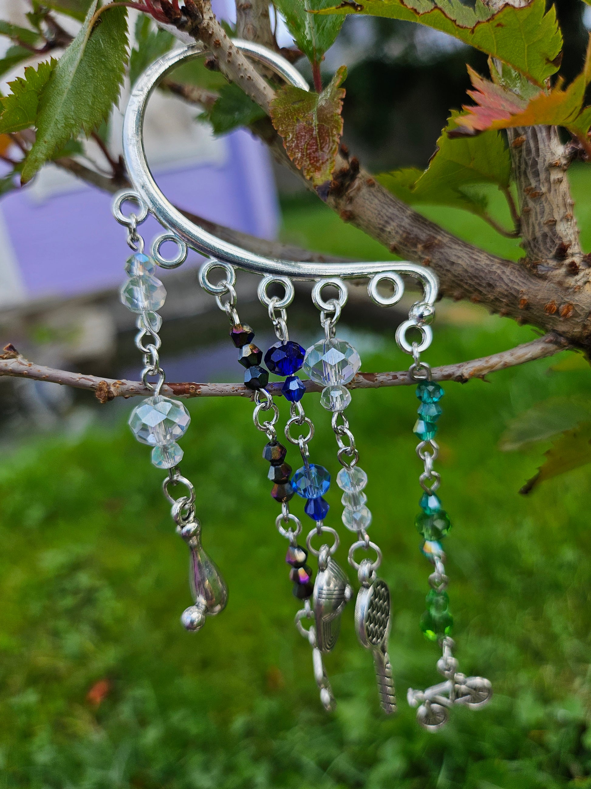 This ear cuff has a silver base. There are strands of beads on eye pins in various sport shade colors: blue, green, black and white/iridescent. At the end of the eye pin strands are sports charms.