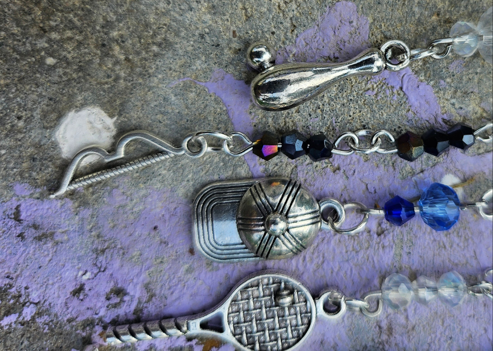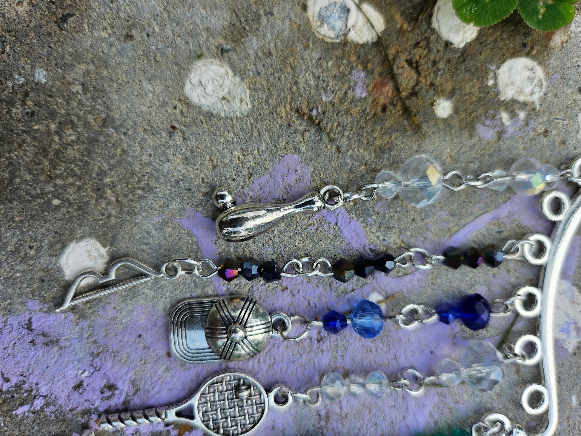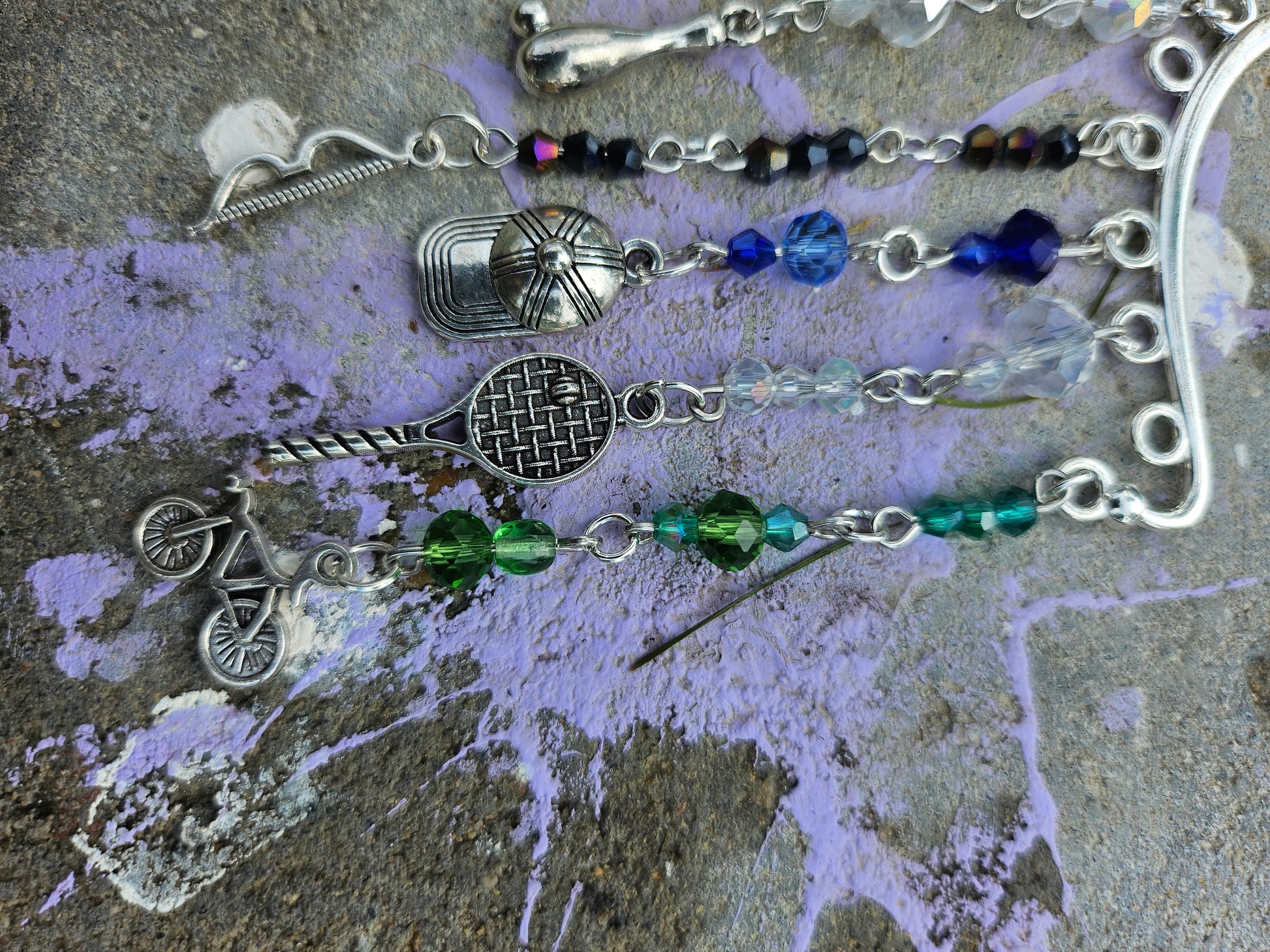 This ear cuff has a silver base. There are strands of beads on eye pins in various sport shade colors: blue, green, black and white/iridescent. At the end of the eye pin strands are sports charms.