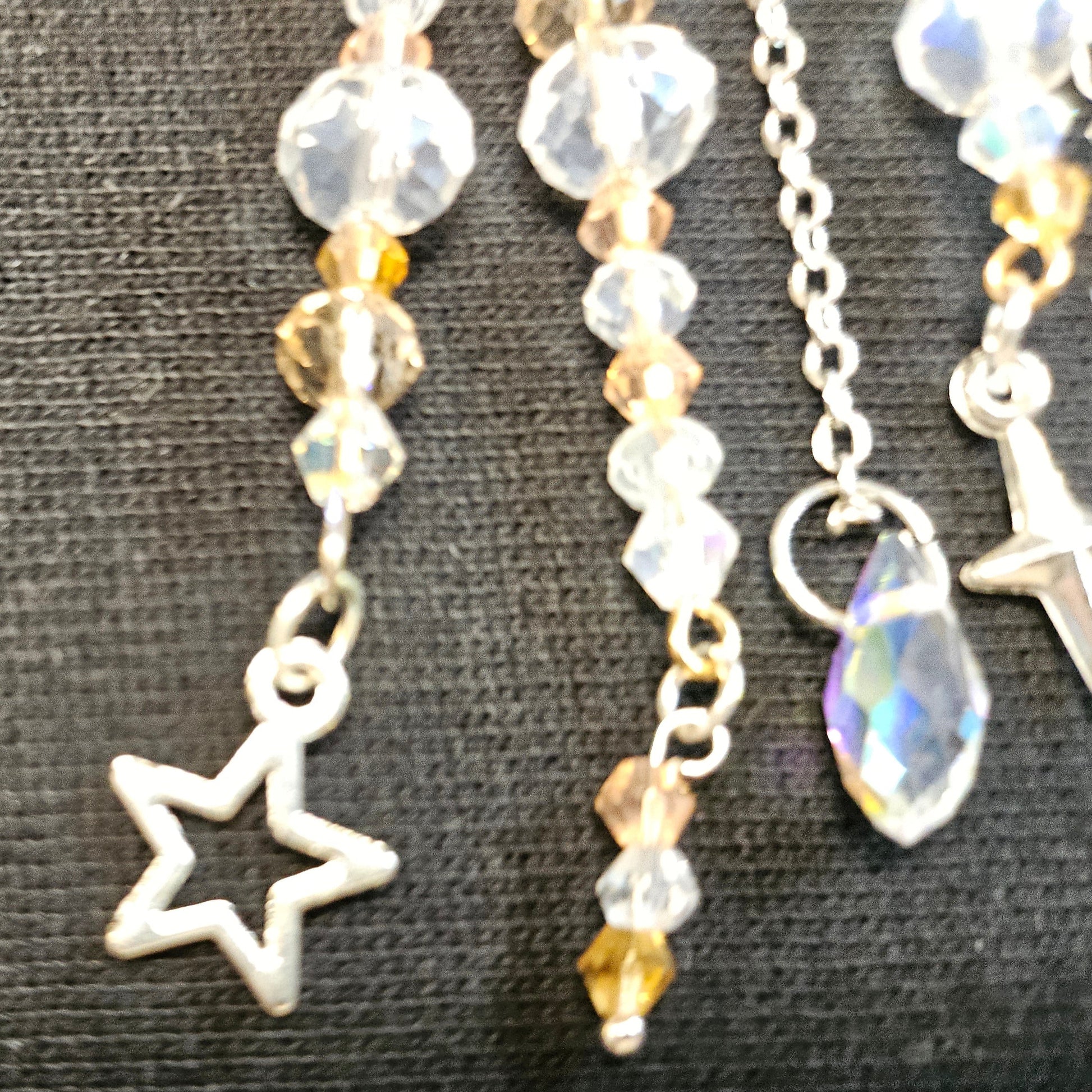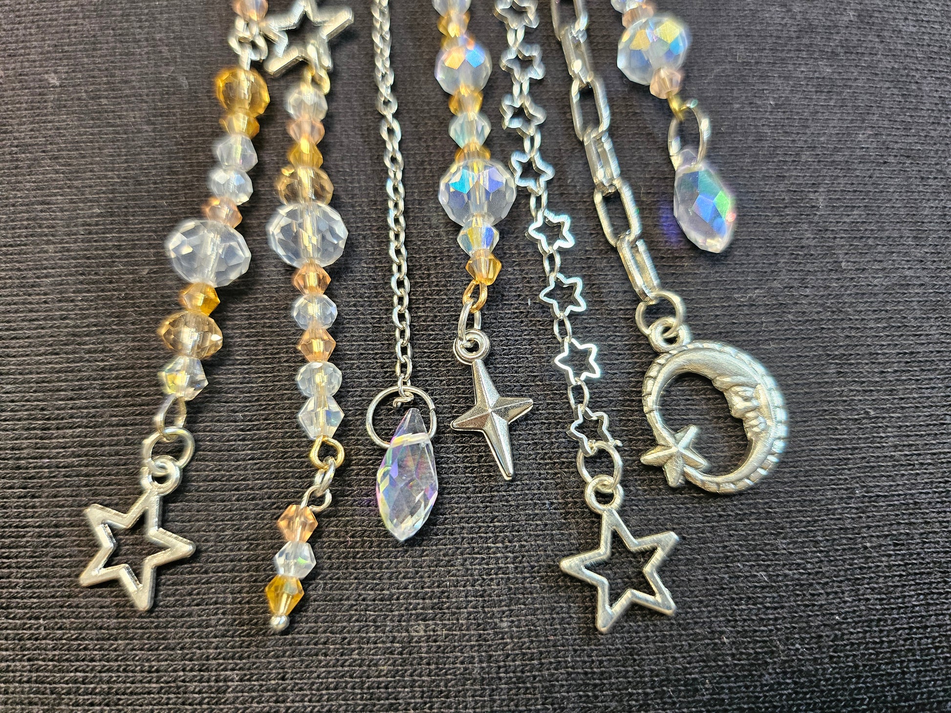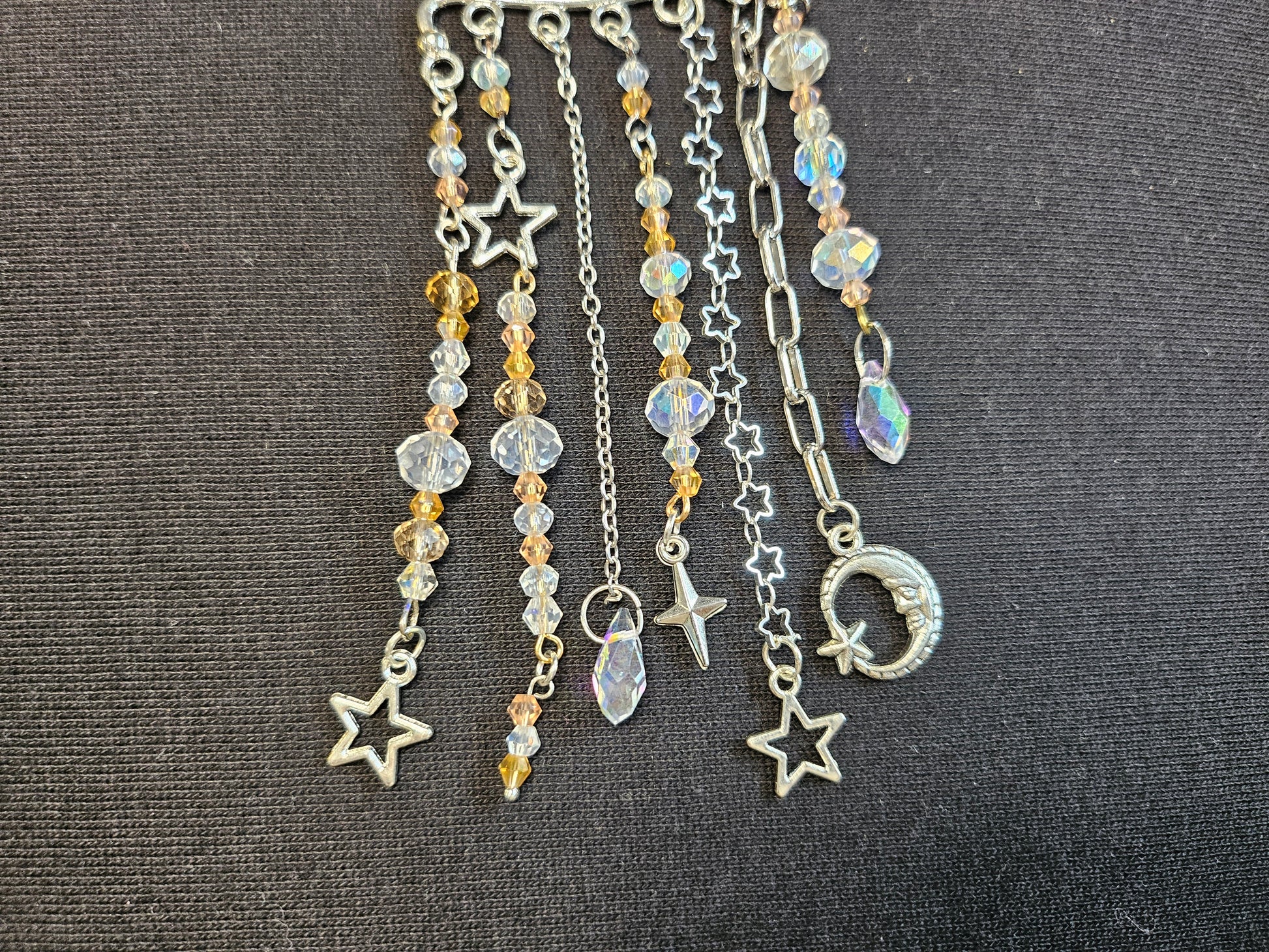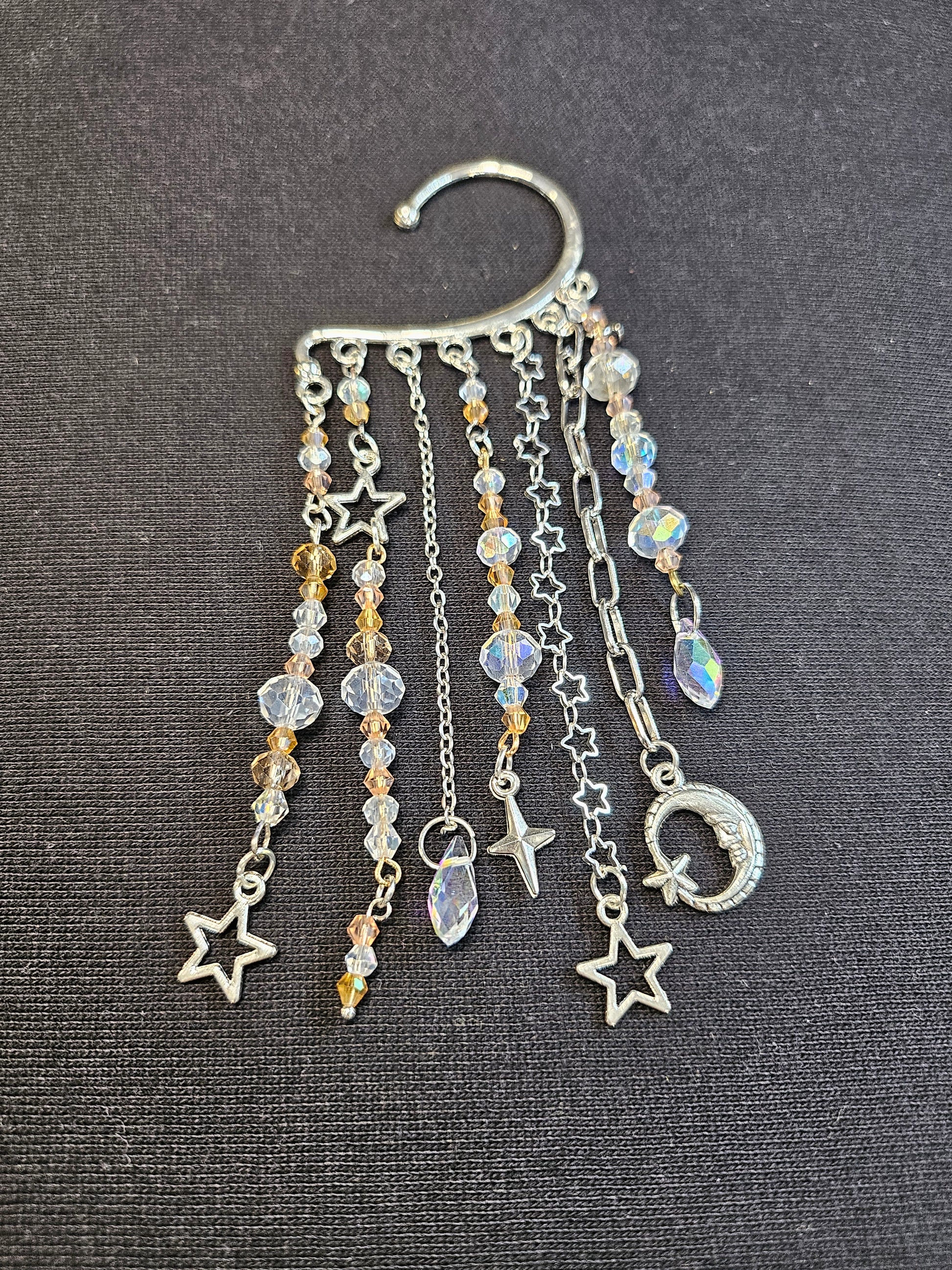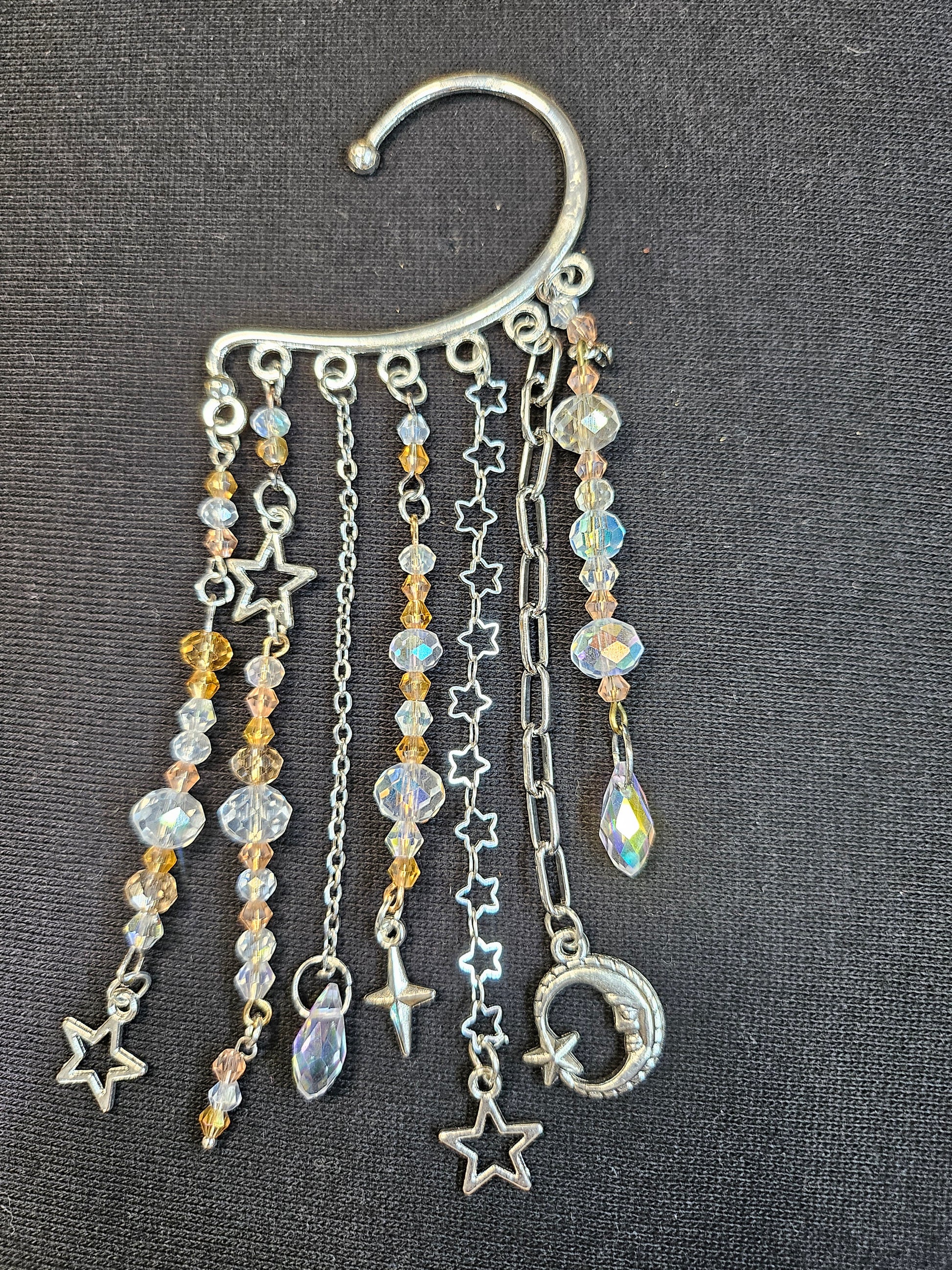 This ear cuff has a silver base. There are strands of iridescent beads in yellow and clear. There are various chains of silver with a variety of moon and star charms.