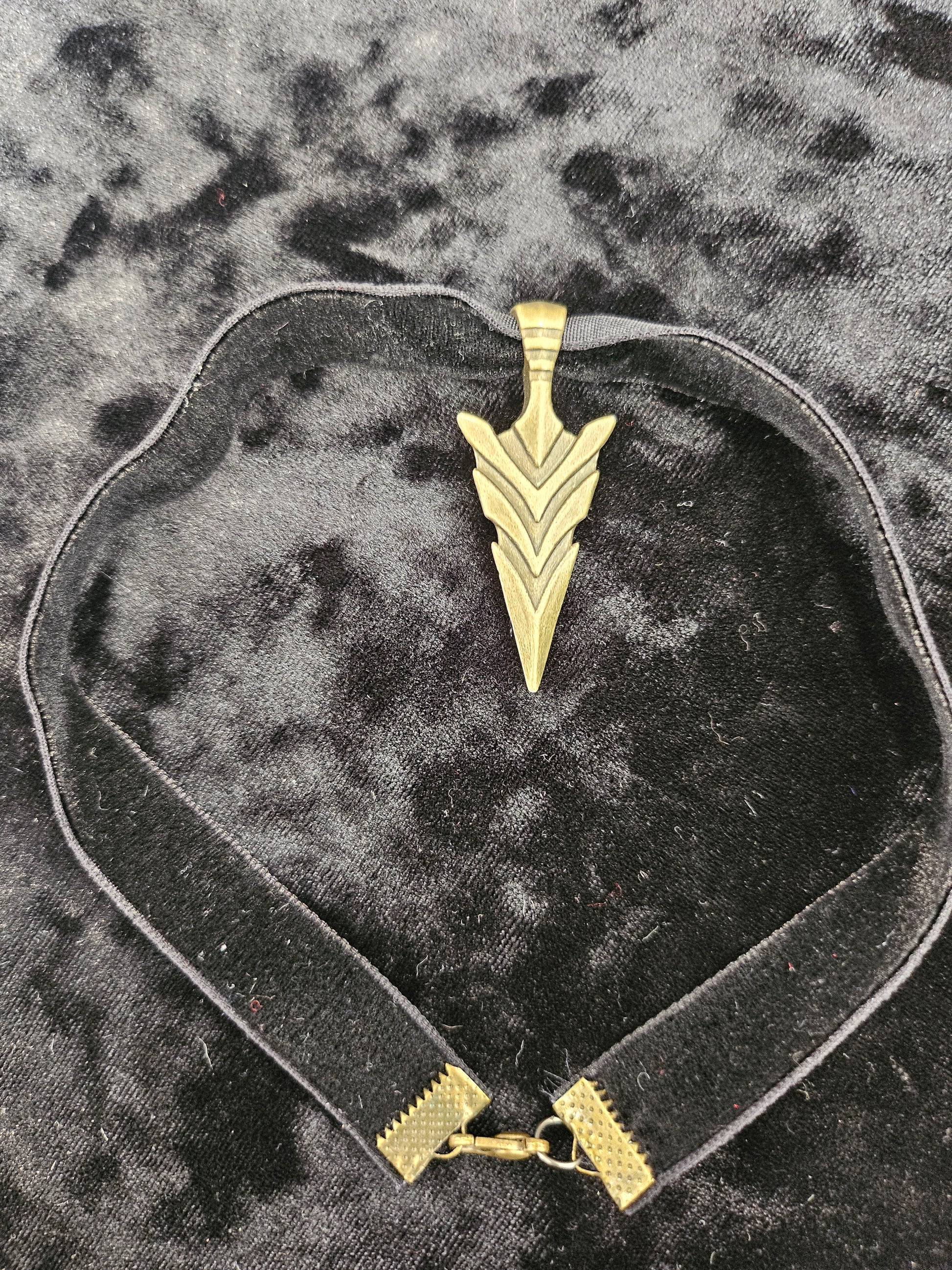 This is a handmade choker with an arrowhead charm on a velvet ribbon. The ends are crimped to prevent fraying. The closure is a lobster clasp and necklace extenders.