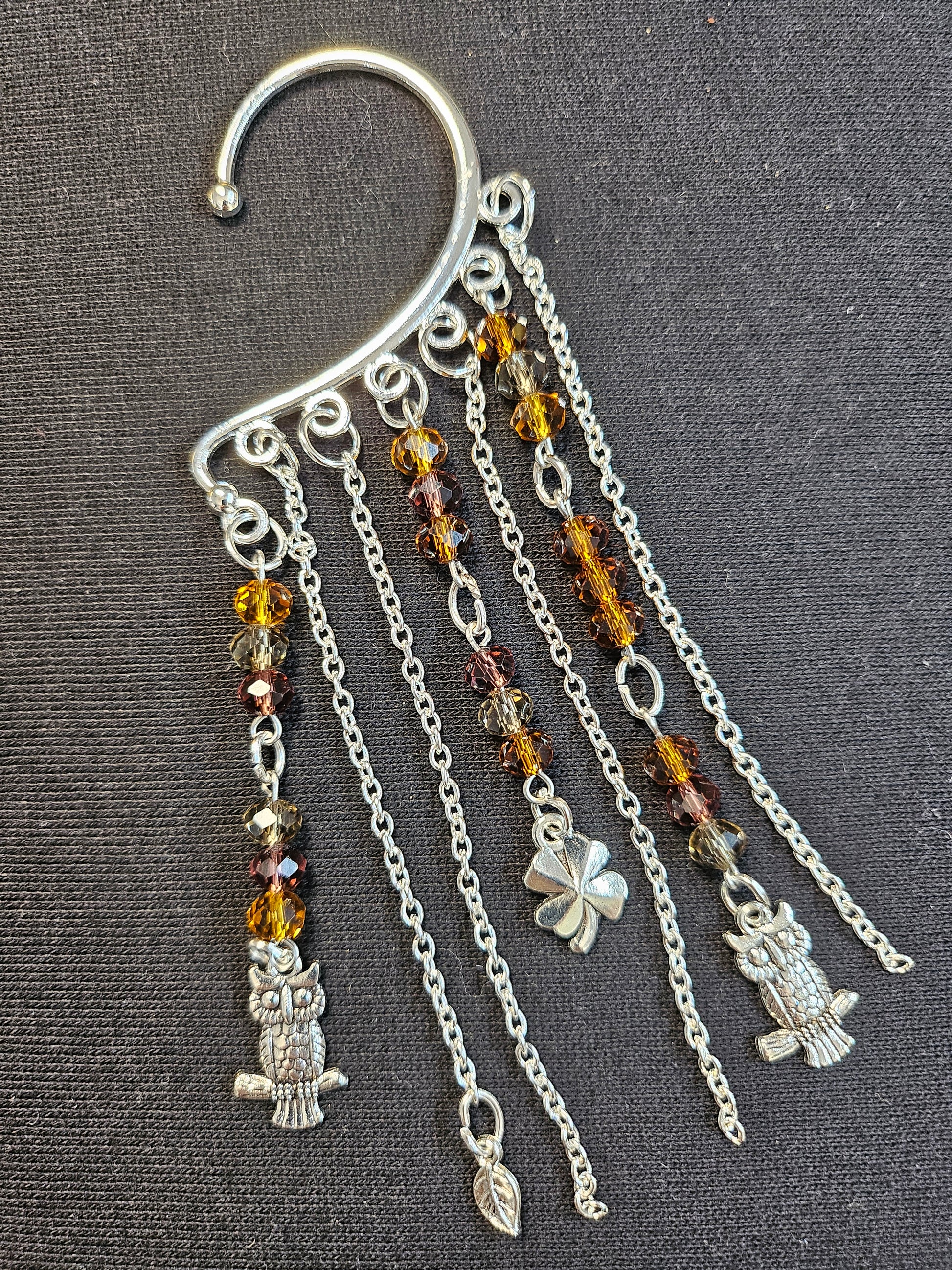 This ear cuff has a base. There are 4 silver strands with 1 leaf charm. There are three hand-beaded eye-pin strands in shades of brown with two owl charms and a 4 leaf cover charm.