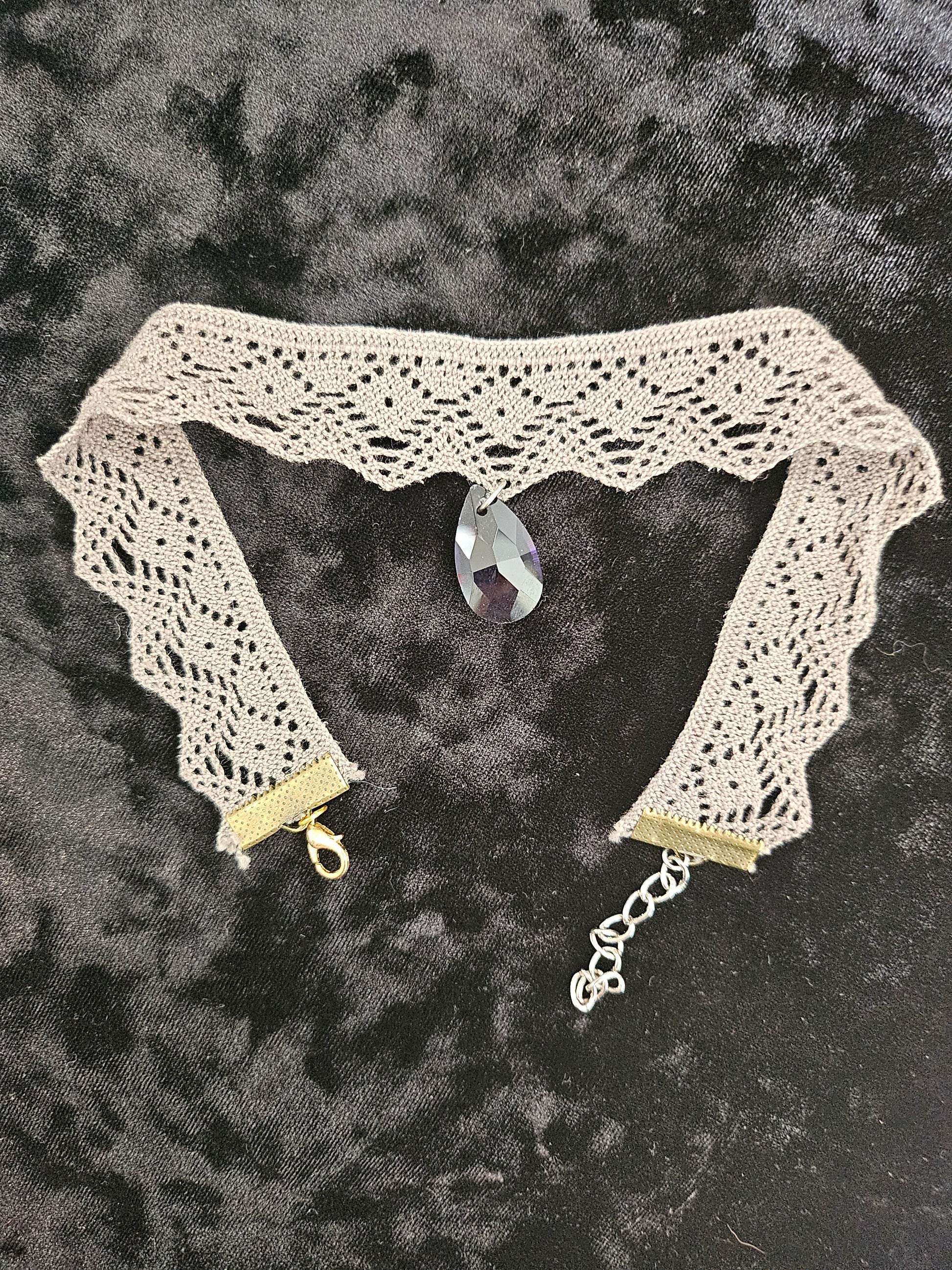 This is a hand-made gray lace choker with a dark gem in the center. The ends of the ribbon have crimps to prevent fraying. There is a lobster clasp and necklace extenders.