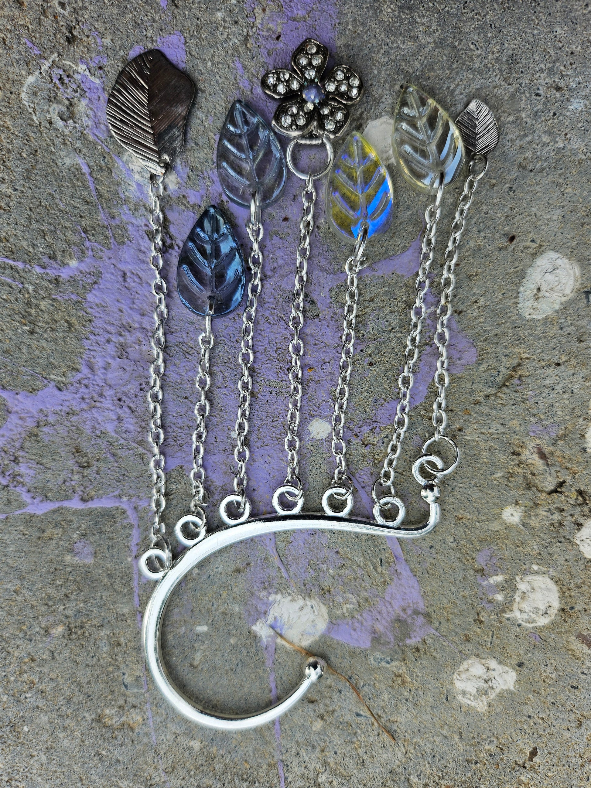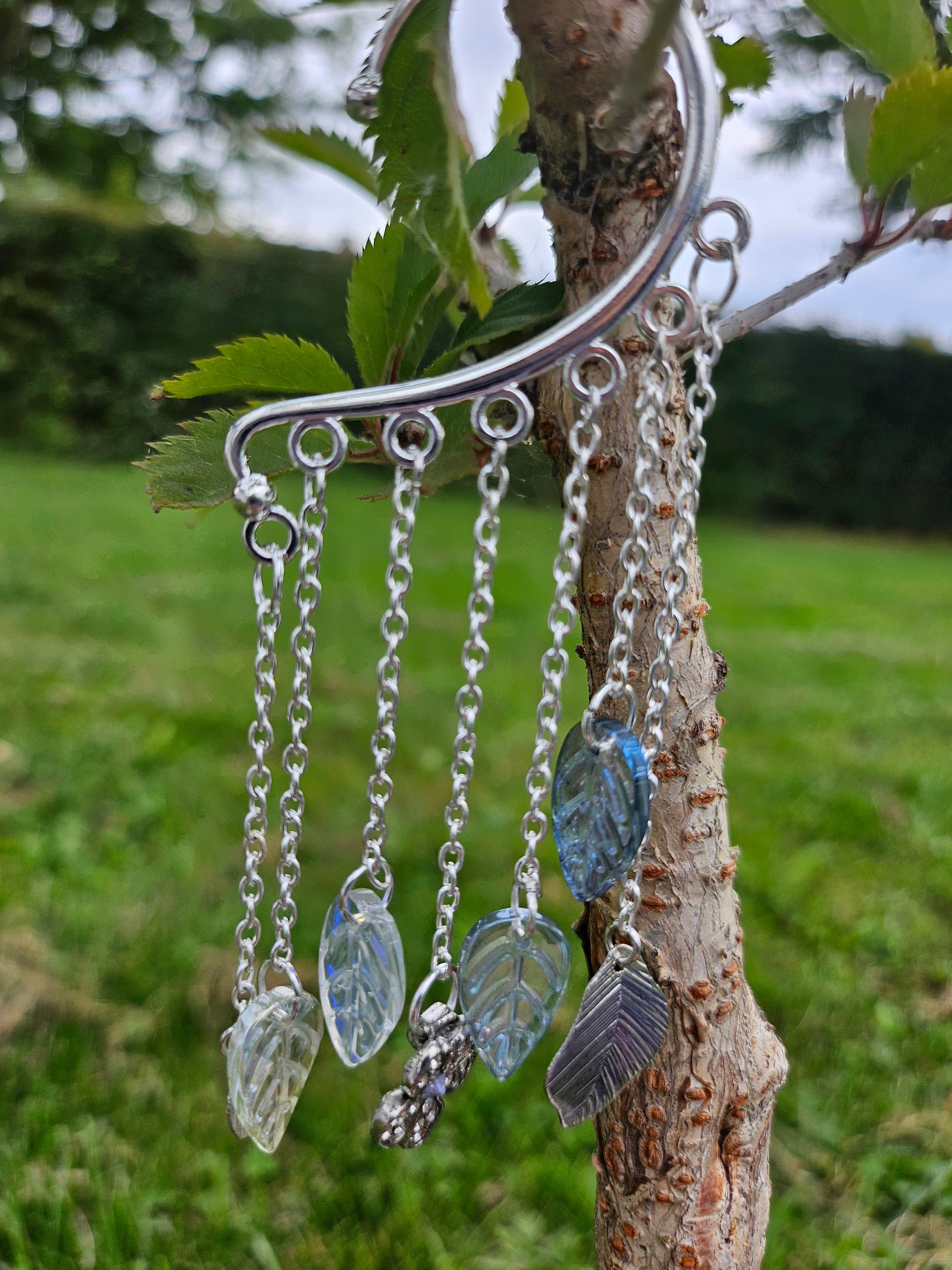 This ear cuff's base is silver. There is a mix of blue and clear beads along with bellflower beads and an iridescent leaf charm.