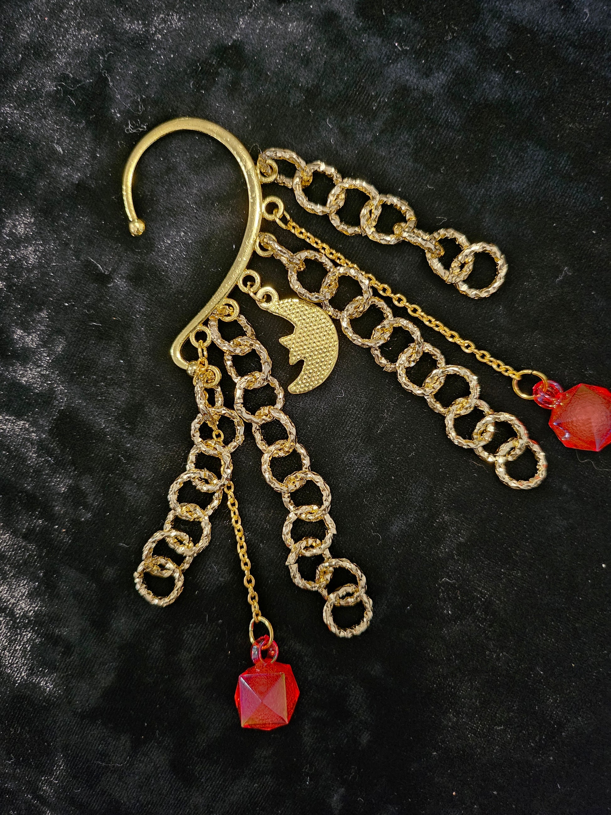 This ear cuff has a base of gold with 4 big golden hoop strands and 2 dainty gold chain strands. At the end of the 2 dainty gold strands are dimensional red bead-charms. There is a moon in the center of the ear cuff.